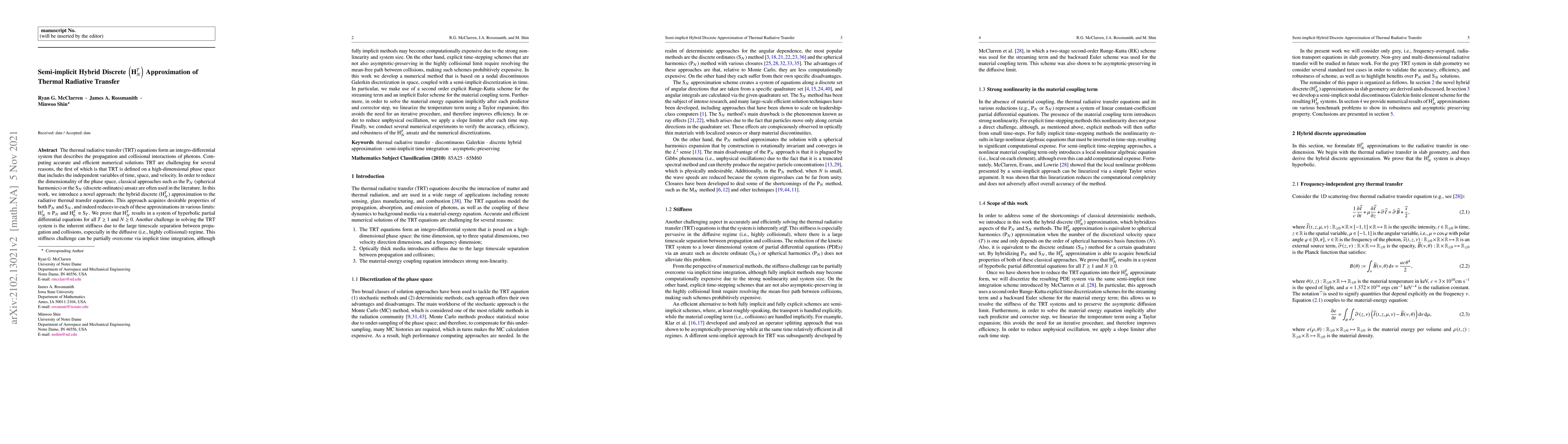 The thermal radiative transfer (TRT) equations form an integro-differential system that describes the propagation and collisional interactions of photons. Computing accurate and efficient numerical solutions TRT are challenging for several reasons, the first of which is that TRT is defined on a high-dimensional phase. In order to reduce the dimensionality of the phase space, classical approaches such as the P$_N$ (spherical harmonics) or the S$_N$ (discrete ordinates) ansatz are often used in the literature. In this work, we introduce a novel approach: the hybrid discrete (H$^T_N$) approximation to the radiative thermal transfer equations. This approach acquires desirable properties of both P$_N$ and S$_N$, and indeed reduces to each of these approximations in various limits: H$^1_N$ $\equiv$ P$_N$ and H$^T_0$ $\equiv$ S$_T$. We prove that H$^T_N$ results in a system of hyperbolic equations for all $T\ge 1$ and $N\ge 0$. Another challenge in solving the TRT system is the inherent stiffness due to the large timescale separation between propagation and collisions, especially in the diffusive (i.e., highly collisional) regime. This stiffness challenge can be partially overcome via implicit time integration, although fully implicit methods may become computationally expensive due to the strong nonlinearity and system size. On the other hand, explicit time-stepping schemes that are not also asymptotic-preserving in the highly collisional limit require resolving the mean-free path between collisions, making such schemes prohibitively expensive. In this work we develop a numerical method that is based on a nodal discontinuous Galerkin discretization in space, coupled with a semi-implicit discretization in time. We conduct several numerical experiments to verify the accuracy, efficiency, and robustness of the H$^T_N$ ansatz and the numerical discretizations.