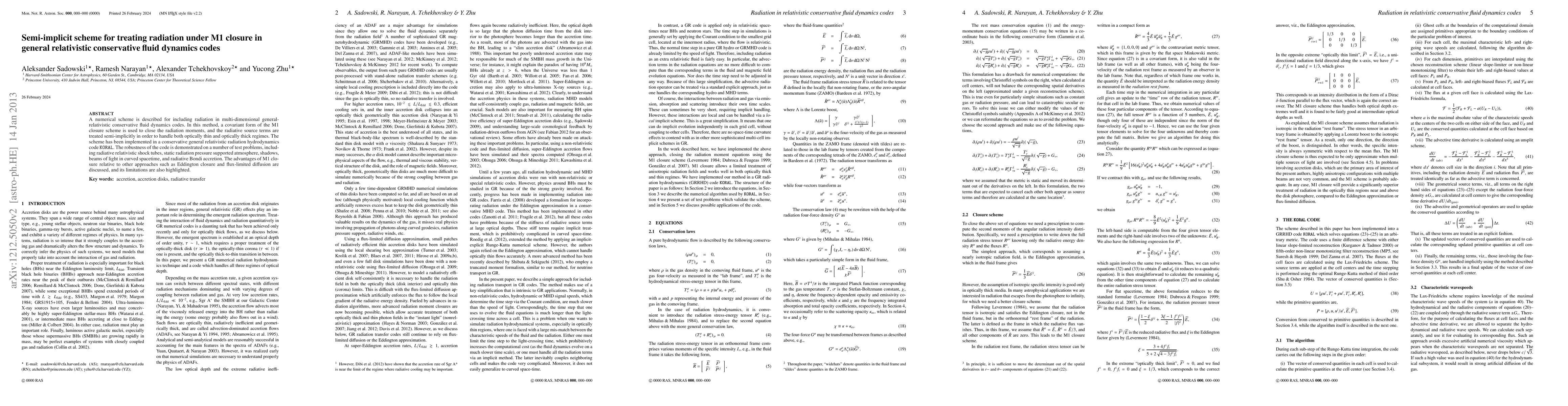 This paper presents a semi-implicit numerical scheme for incorporating radiation in general-relativistic fluid dynamics codes using the M1 closure scheme, demonstrating its robustness through various test problems. The method effectively handles both optically thin and thick regimes, with advantages and limitations compared to other closure methods discussed.