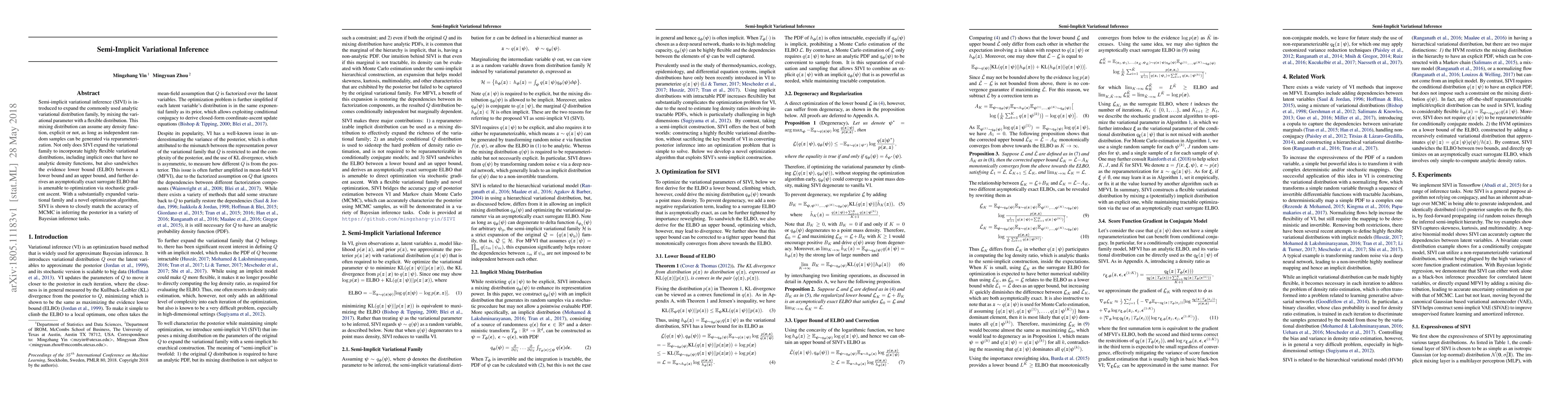 Semi-Implicit Variational Inference (SIVI) extends the variational inference framework by incorporating flexible distributions, including implicit ones, through a mixing distribution. It provides an asymptotically exact surrogate ELBO for optimization, achieving posterior inference accuracy comparable to MCMC in various Bayesian tasks.