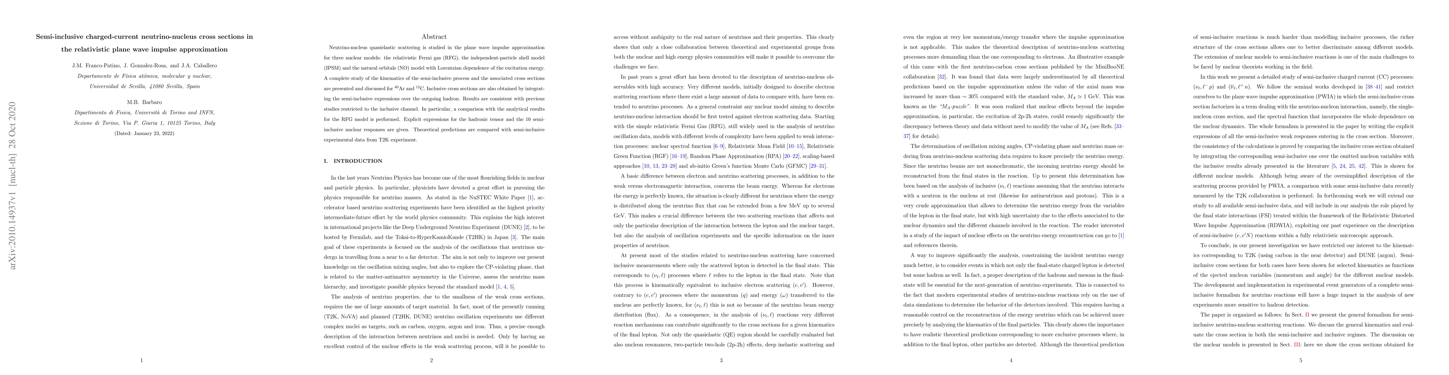 This paper investigates semi-inclusive charged-current neutrino-nucleus cross sections using the relativistic plane wave impulse approximation for three nuclear models: RFG, IPSM, and NO. Theoretical predictions are compared with T2K experimental data, showing consistency with previous inclusive studies.