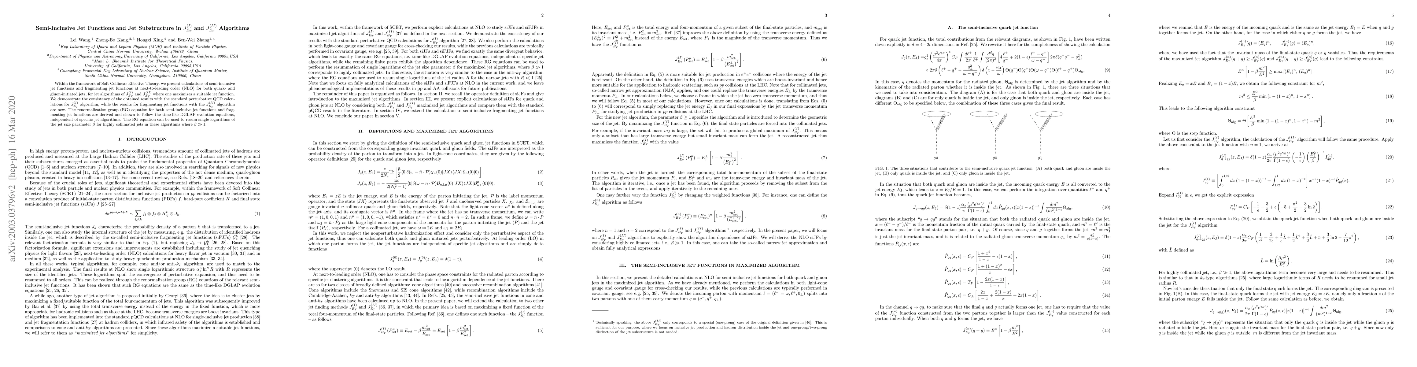 Within the framework of Soft Collinear Effective Theory, we present calculations of semi-inclusive jet functions and fragmenting jet functions at next-to-leading order (NLO) for both quark- and gluon-initiated jets, for jet algorithms of $J_{E_T}^{(I)}$ and $J_{E_T}^{(II)}$ where one maximizes a suitable jet function. We demonstrate the consistency of the obtained results with the standard perturbative QCD calculations for $J_{E_T}^{(I)}$ algorithm, while the results for fragmenting jet functions with the $J_{E_T}^{(II)}$ algorithm are new. The renormalization group (RG) equation for both semi-inclusive jet functions and fragmenting jet functions are derived and shown to follow the time-like DGLAP evolution equations, independent of specific jet algorithms. The RG equation can be used to resum single logarithms of the jet size parameter $\beta$ for highly collimated jets in these algorithms where $\beta \gg 1$.