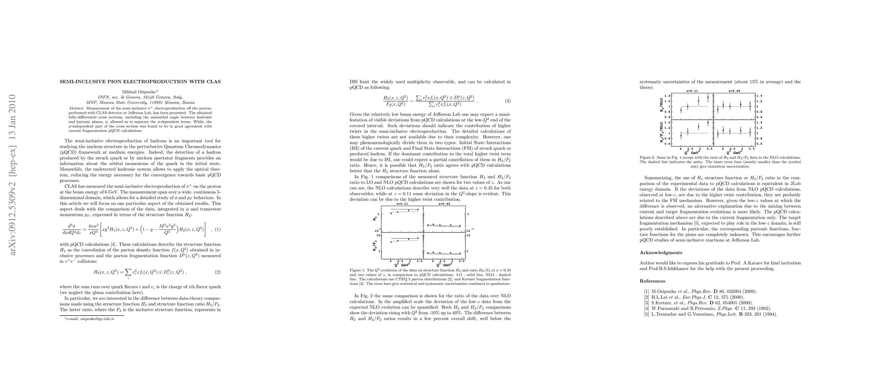 Measurement of the semi-inclusive pi+ electroproduction off the proton, performed with CLAS detector at Jefferson Lab, has been presented. The obtained fully-differential cross sections, including the azimuthal angle between hadronic and leptonic planes, phi, allowed us to separate the phi-dependent terms. While, the phi-independent part of the cross section was found to be in good agreement with current fragmentation pQCD calculations.