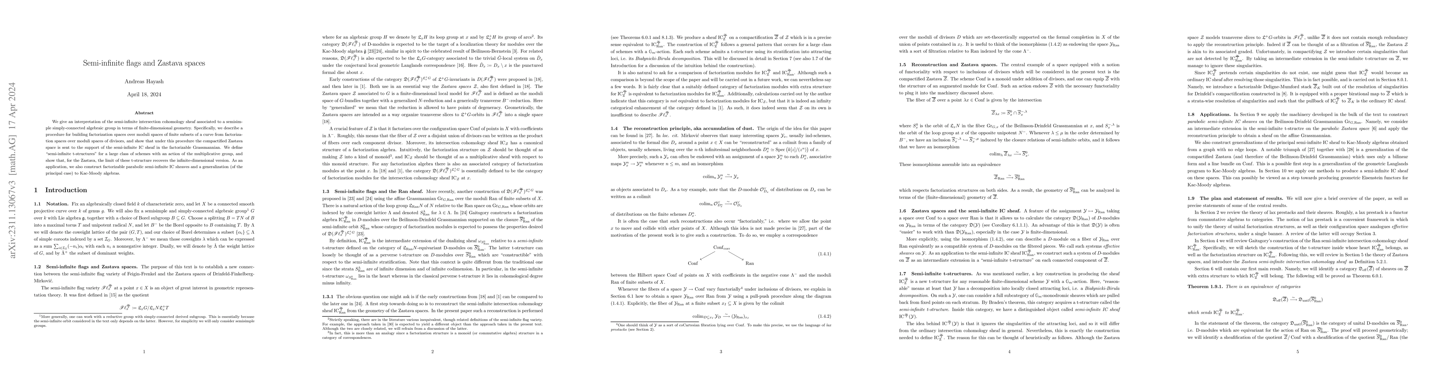 We give an interpretation of the semi-infinite intersection cohomology sheaf associated to a semisimple simply-connected algebraic group in terms of finite-dimensional geometry. Specifically, we describe a procedure for building factorization spaces over moduli spaces of finite subsets of a curve from factorization spaces over moduli spaces of divisors, and show that under this procedure the compactified Zastava space is sent to the support of the semi-infinite IC sheaf in the factorizable Grassmannian. We define "semi-infinite t-structures" for a large class of schemes with an action of the multiplicative group, and show that, for the Zastava, the limit of these t-structure recovers the infinite-dimensional version. As an application, we also construct factorizable parabolic semi-infinite IC sheaves and a generalization (of the principal case) to Kac-Moody algebras.