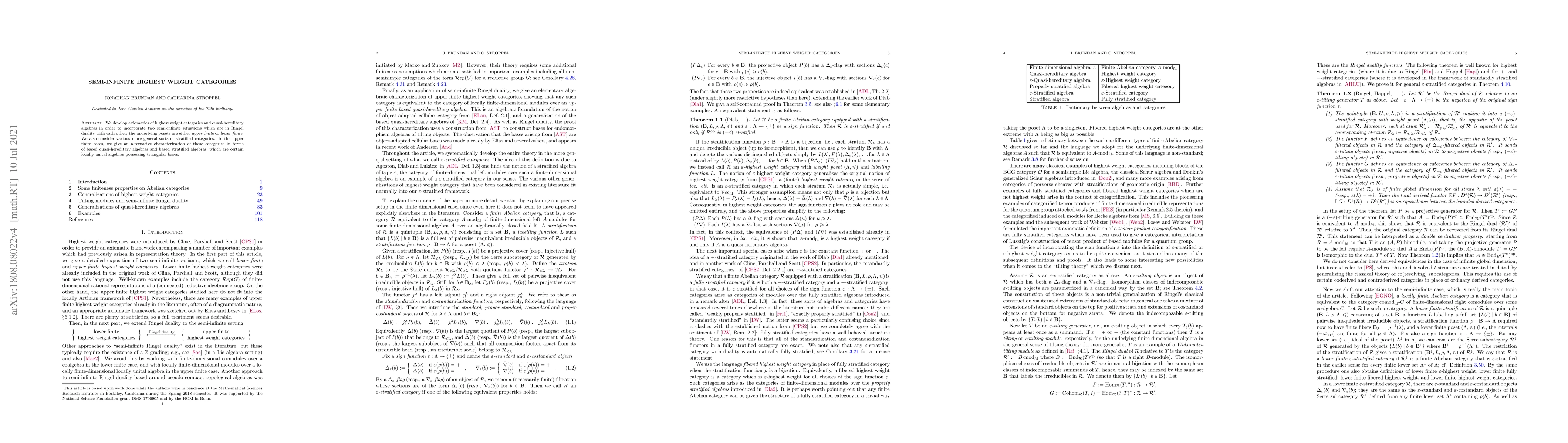 Summary: The paper introduces axiomatics for highest weight categories and quasi-hereditary algebras to accommodate semi-infinite situations linked by Ringel duality. It provides an alternative characterization of these categories using based quasi-hereditary and based stratified algebras.