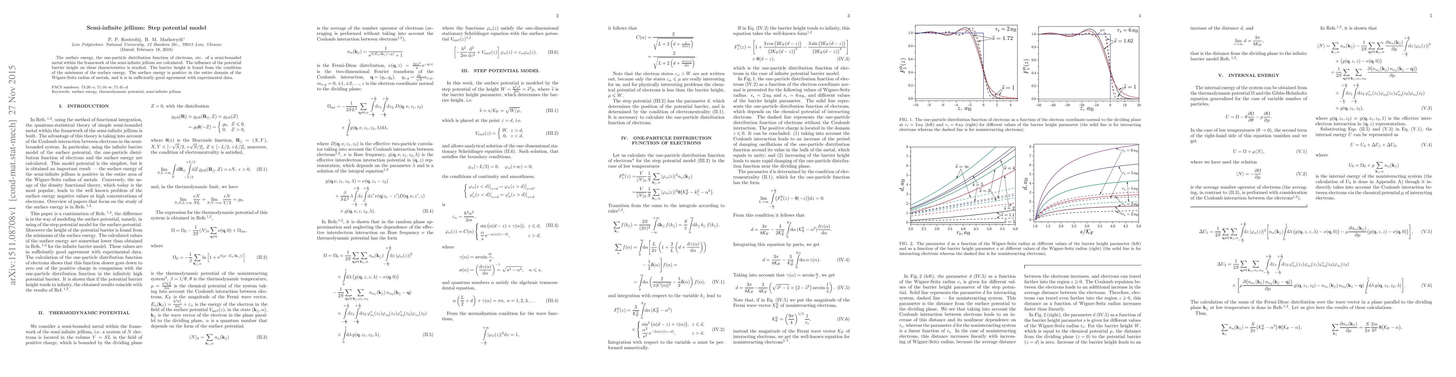 This paper calculates the surface energy and electron distribution in a semi-infinite jellium model with a step potential barrier, finding that the surface energy is positive across all Wigner-Seitz radii and aligns well with experimental data. The study determines the optimal barrier height that minimizes surface energy.