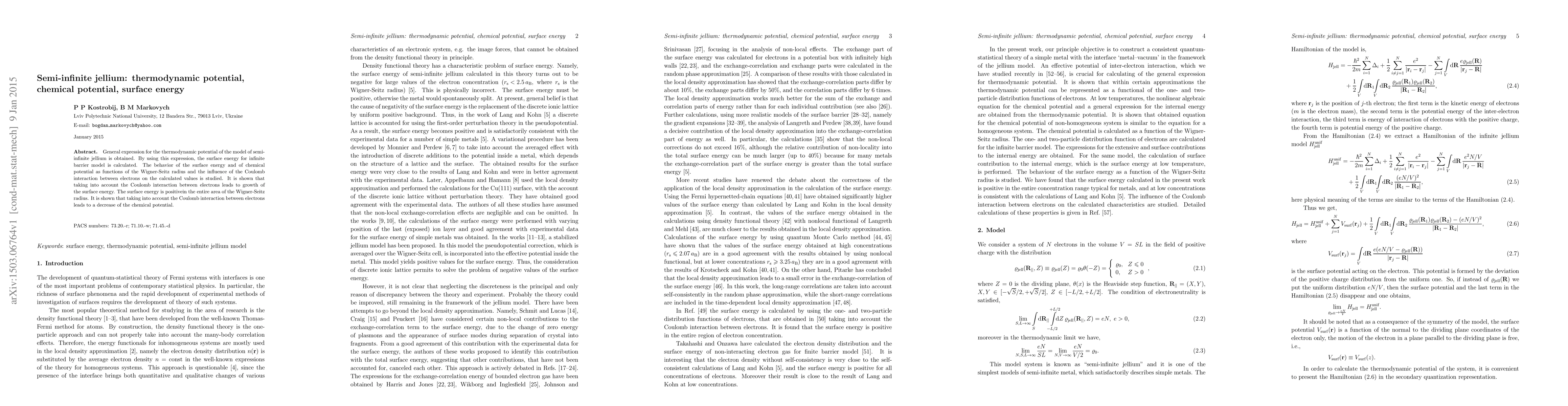 This paper derives the thermodynamic potential for semi-infinite jellium and calculates its surface energy, revealing that Coulomb interaction between electrons increases surface energy and decreases the chemical potential. The study emphasizes the influence of the Wigner-Seitz radius on these properties.
