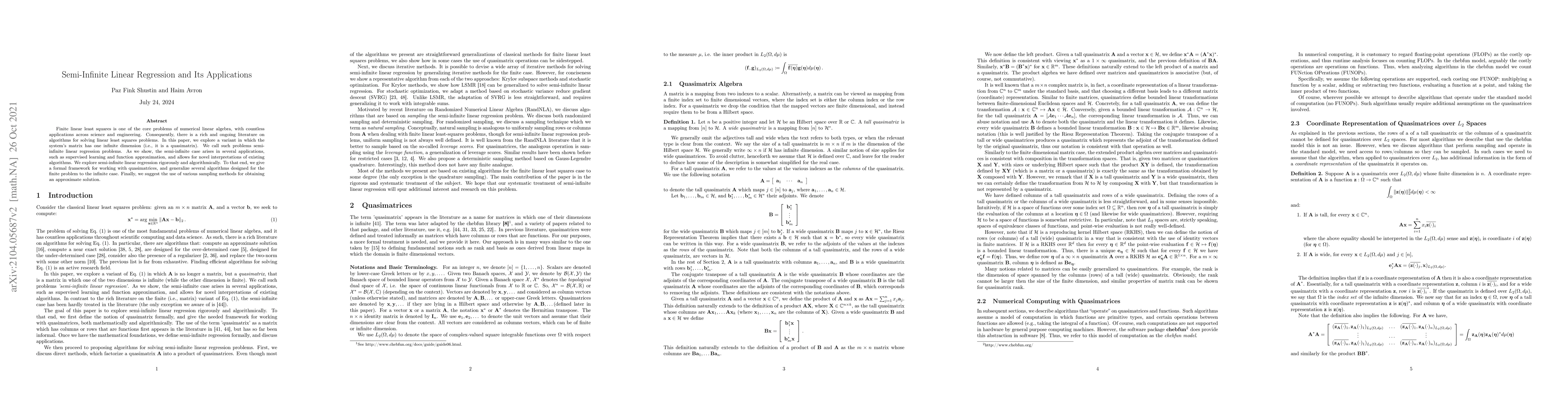 This paper investigates semi-infinite linear regression, a variant of linear least squares where the system matrix has an infinite dimension, termed a quasimatrix. It explores applications in supervised learning and function approximation, proposes a formal framework for quasimatrices, and generalizes finite algorithms to the infinite case, suggesting sampling methods for approximate solutions.