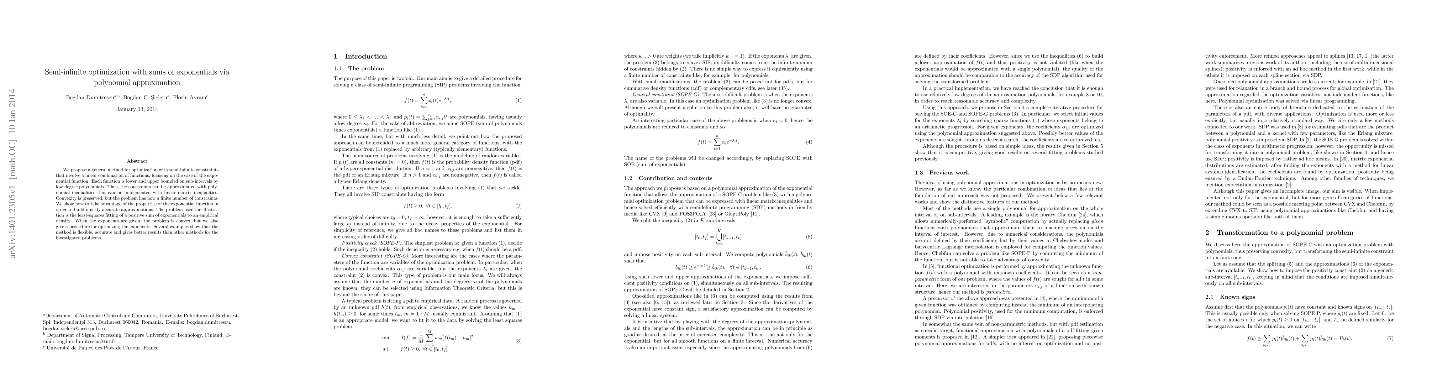 This paper presents a method for optimizing semi-infinite constraints using polynomial approximations of exponential functions, converting them into convex linear matrix inequalities. The method is demonstrated through least-squares fitting of positive sums of exponentials, showing flexibility, accuracy, and superior performance compared to other techniques.