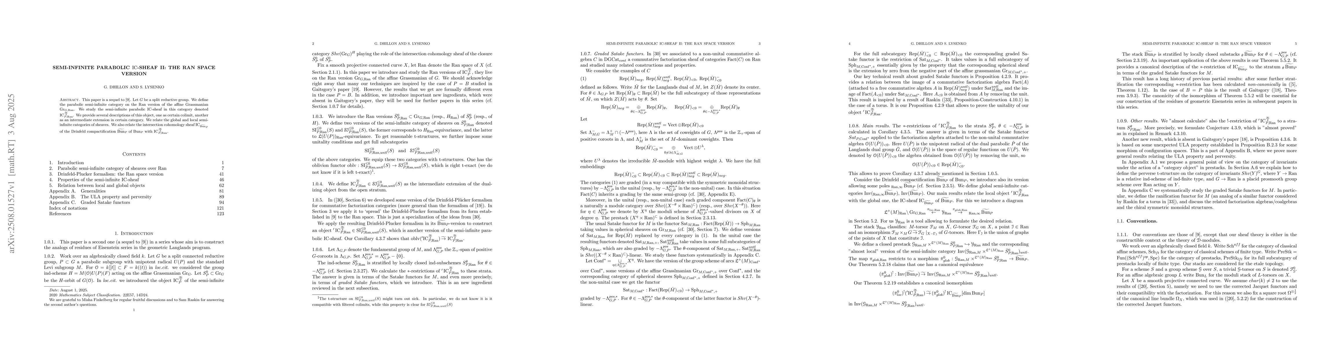This paper is a sequel to arXiv:2310.0638. Let G be a split reductive group. We define the parabolic semi-infinite category on the Ran version of the affine Grassmanian Gr_{G,Ran}. We study the semi-infinite parabolic IC-sheaf in this category. We provide several descriptions of this object, one as certain colimit, another as an intermediate extension in certain category. We relate the global and local semi-infinite categories of sheaves. We also relate the intersection cohomology sheaf of the Drinfeld compactification of Bun_P with the semi-infinite parabolic IC-sheaf.