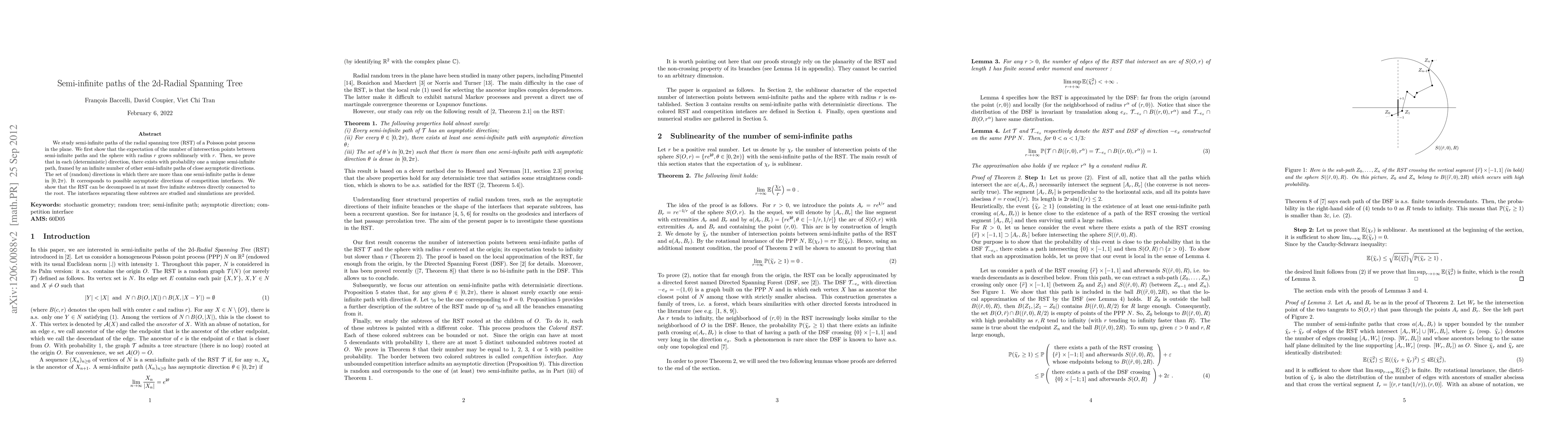We study semi-infinite paths of the radial spanning tree (RST) of a Poisson point process in the plane. We first show that the expectation of the number of intersection points between semi-infinite paths and the sphere with radius $r$ grows sublinearly with $r$. Then, we prove that in each (deterministic) direction, there exists with probability one a unique semi-infinite path, framed by an infinite number of other semi-infinite paths of close asymptotic directions. The set of (random) directions in which there are more than one semi-infinite paths is dense in $[0,2\pi)$. It corresponds to possible asymptotic directions of competition interfaces. We show that the RST can be decomposed in at most five infinite subtrees directly connected to the root. The interfaces separating these subtrees are studied and simulations are provided.