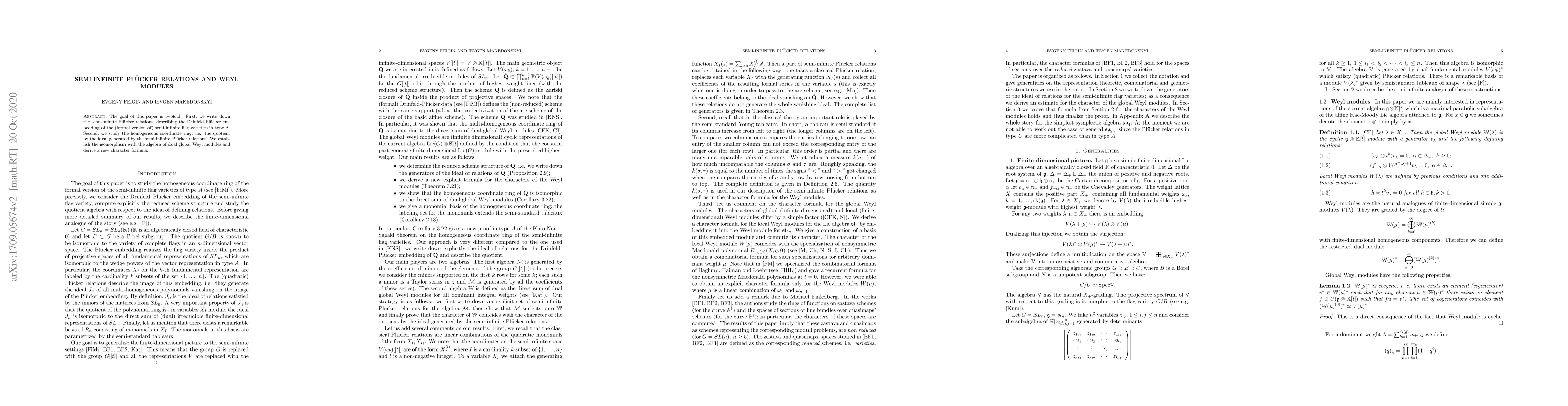 This paper derives the semi-infinite Plücker relations for the Drinfeld-Plücker embedding of semi-infinite flag varieties in type A and demonstrates an isomorphism between the quotient ring formed by these relations and the algebra of dual global Weyl modules, providing a new character formula.