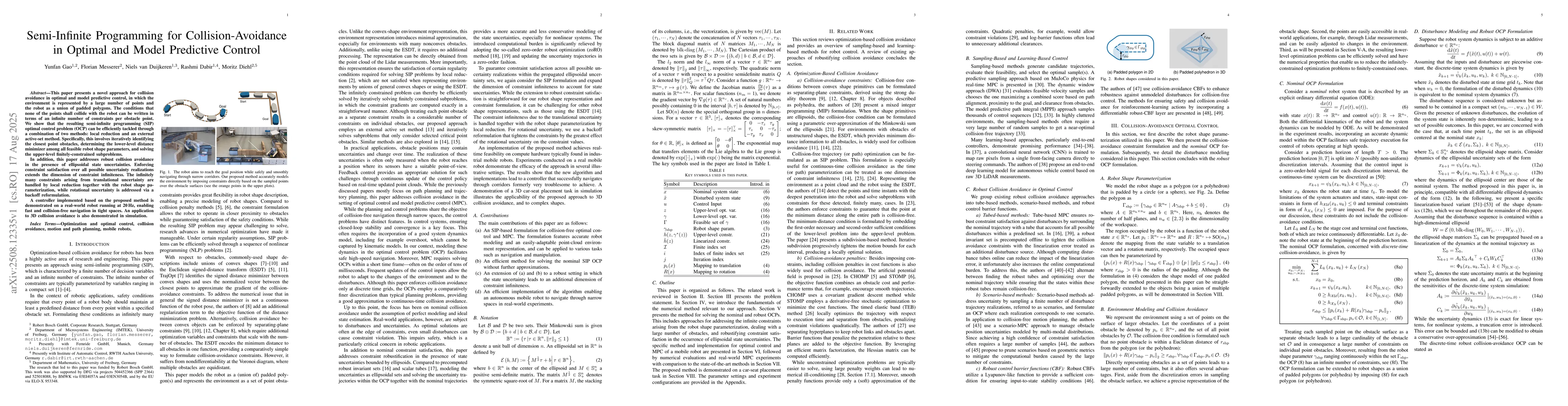 This paper presents a novel approach for collision avoidance in optimal and model predictive control, in which the environment is represented by a large number of points and the robot as a union of padded polygons. The conditions that none of the points shall collide with the robot can be written in terms of an infinite number of constraints per obstacle point. We show that the resulting semi-infinite programming (SIP) optimal control problem (OCP) can be efficiently tackled through a combination of two methods: local reduction and an external active-set method. Specifically, this involves iteratively identifying the closest point obstacles, determining the lower-level distance minimizer among all feasible robot shape parameters, and solving the upper-level finitely-constrained subproblems. In addition, this paper addresses robust collision avoidance in the presence of ellipsoidal state uncertainties. Enforcing constraint satisfaction over all possible uncertainty realizations extends the dimension of constraint infiniteness. The infinitely many constraints arising from translational uncertainty are handled by local reduction together with the robot shape parameterization, while rotational uncertainty is addressed via a backoff reformulation. A controller implemented based on the proposed method is demonstrated on a real-world robot running at 20Hz, enabling fast and collision-free navigation in tight spaces. An application to 3D collision avoidance is also demonstrated in simulation.