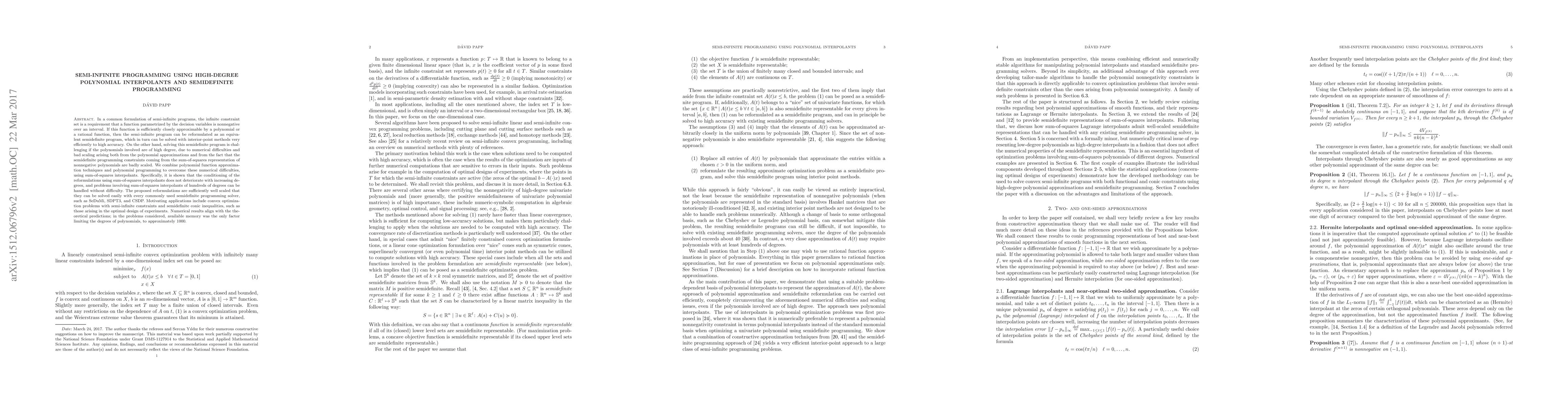 This paper reformulates semi-infinite programs using high-degree polynomial interpolants and semidefinite programming to address numerical difficulties. It demonstrates that sum-of-squares interpolants maintain good conditioning and scalability, enabling the solution of large-degree polynomial problems efficiently with standard semidefinite programming solvers.