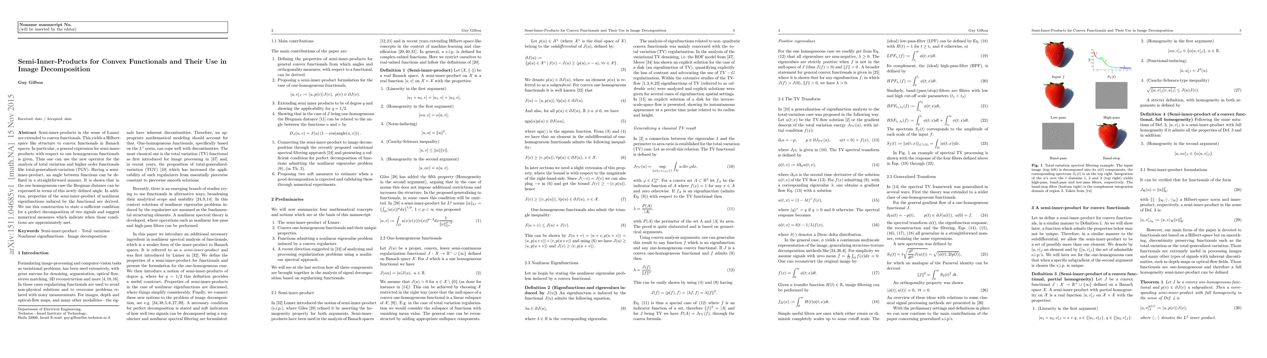 Semi-inner-products in the sense of Lumer are extended to convex functionals. This yields a Hilbert-space like structure to convex functionals in Banach spaces. In particular, a general expression for semi-inner-products with respect to one homogeneous functionals is given. Thus one can use the new operator for the analysis of total variation and higher order functionals like total-generalized-variation (TGV). Having a semi-inner-product, an angle between functions can be defined in a straightforward manner. It is shown that in the one homogeneous case the Bregman distance can be expressed in terms of this newly defined angle. In addition, properties of the semi-inner-product of nonlinear eigenfunctions induced by the functional are derived. We use this construction to state a sufficient condition for a perfect decomposition of two signals and suggest numerical measures which indicate when those conditions are approximately met.