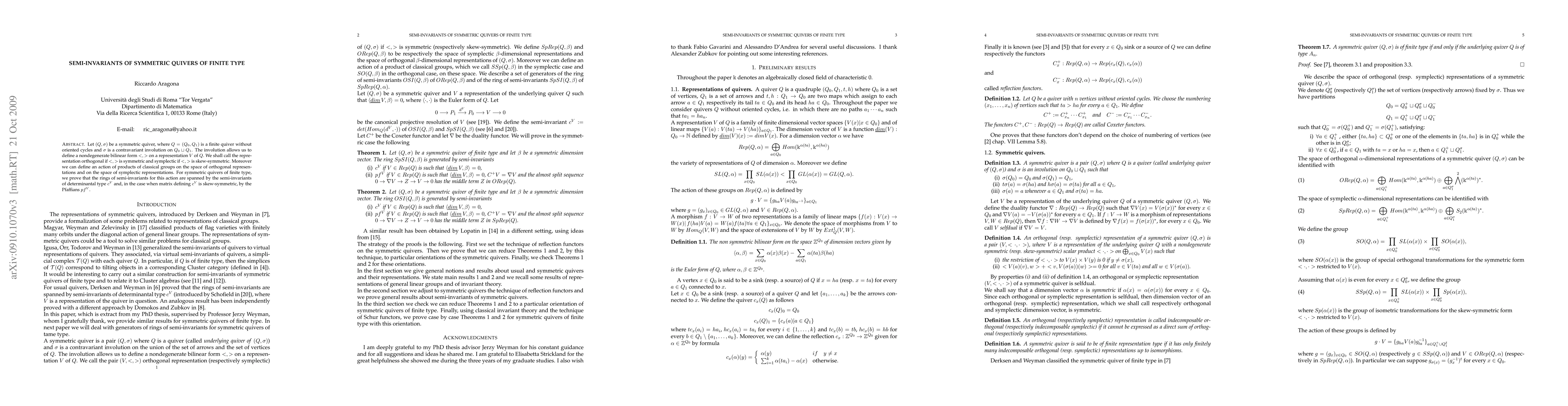 Let $(Q,\sigma)$ be a symmetric quiver, where $Q=(Q_0,Q_1)$ is a finite quiver without oriented cycles and $\sigma$ is a contravariant involution on $Q_0\sqcup Q_1$. The involution allows us to define a nondegenerate bilinear form $<,>$ on a representation $V$ of $Q$. We shall call the representation orthogonal if $<,>$ is symmetric and symplectic if $<,>$ is skew-symmetric. Moreover we can define an action of products of classical groups on the space of orthogonal representations and on the space of symplectic representations. For symmetric quivers of finite type, we prove that the rings of semi-invariants for this action are spanned by the semi-invariants of determinantal type $c^V$ and, in the case when matrix defining $c^V$ is skew-symmetric, by the Pfaffians $pf^V$.