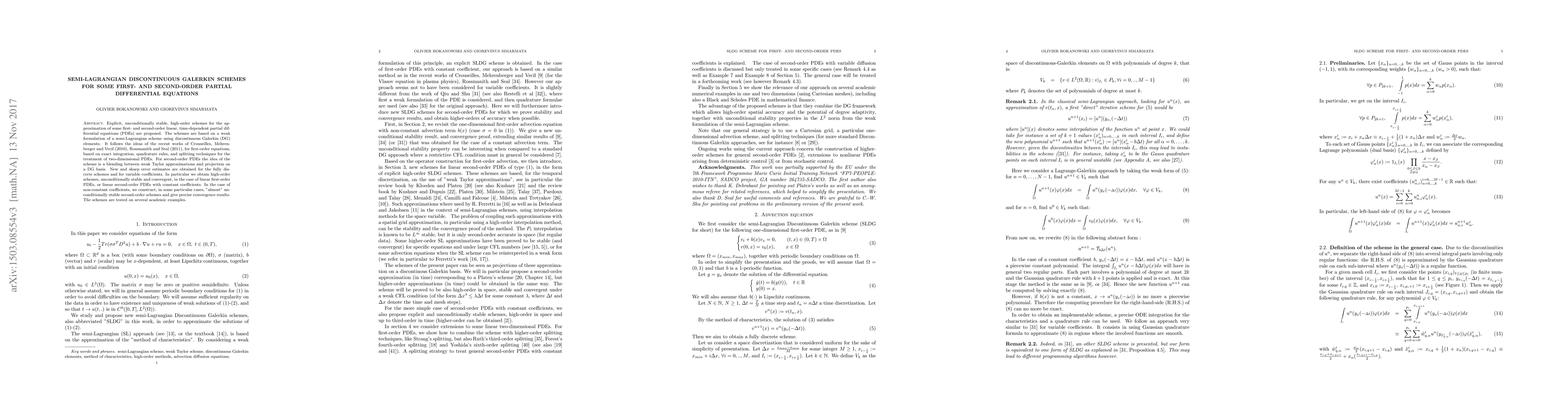 This paper proposes high-order, explicit, and unconditionally stable schemes based on semi-Lagrangian discontinuous Galerkin methods for first- and second-order linear PDEs, achieving sharp error estimates and testing on various examples. The schemes are shown to be convergent for constant coefficients and "almost" unconditionally stable for variable coefficients.