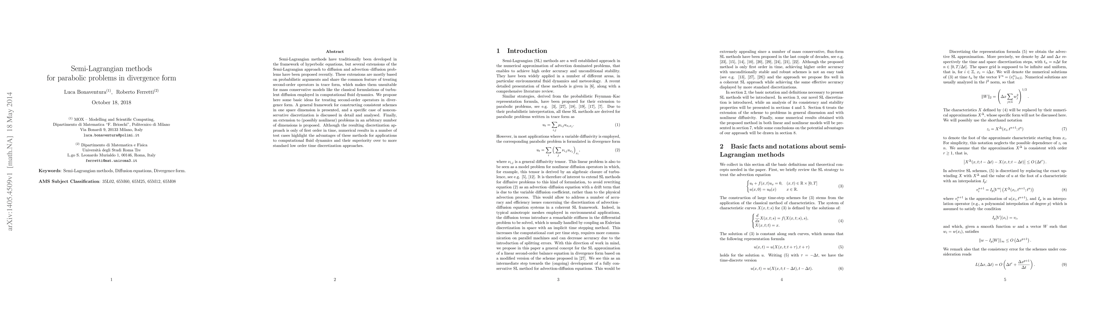 This paper proposes Semi-Lagrangian methods for solving parabolic problems in divergence form, extending the approach beyond traditional hyperbolic equations. The authors present a consistent framework for one-dimensional problems and discuss nonconservative discretization, highlighting the methods' advantages for computational fluid dynamics applications.