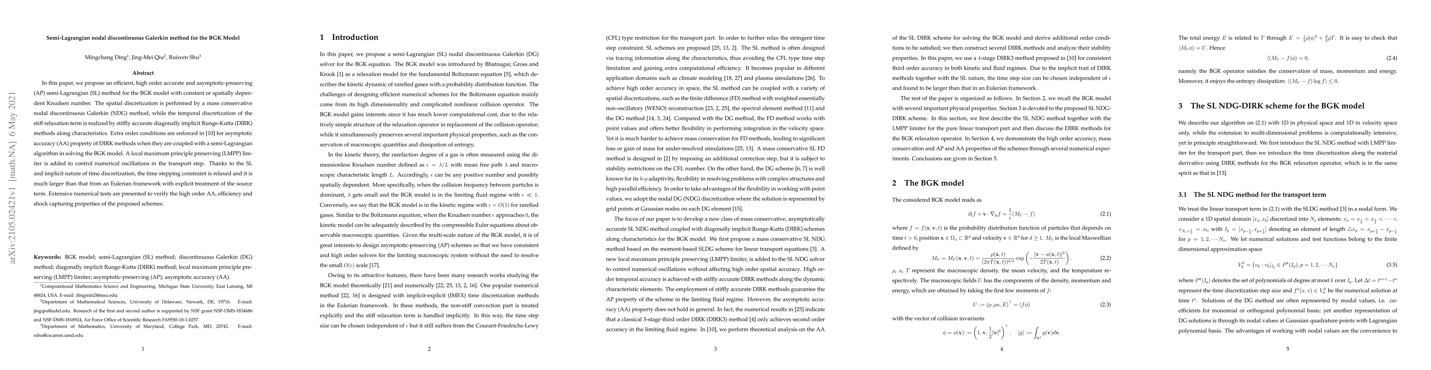 This paper proposes an efficient, high-order semi-Lagrangian nodal discontinuous Galerkin method for the BGK model, featuring asymptotic-preserving properties and shock capturing. The method employs a mass conservative NDG spatial discretization and a stiffly accurate diagonally implicit Runge-Kutta method for time integration, with a local maximum principle preserving limiter to control oscillations.