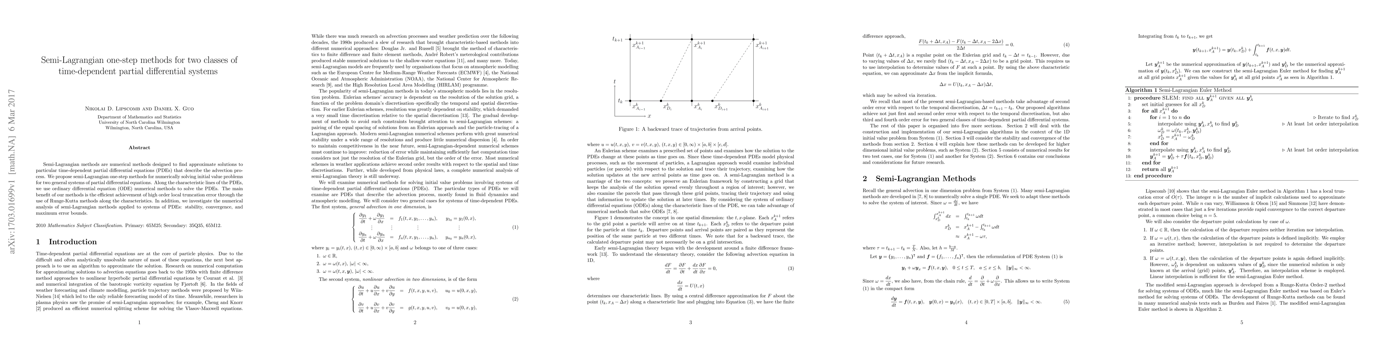 Semi-Lagrangian methods are numerical methods designed to find approximate solutions to particular time-dependent partial differential equations (PDEs) that describe the advection process. We propose semi-Lagrangian one-step methods for numerically solving initial value problems for two general systems of partial differential equations. Along the characteristic lines of the PDEs, we use ordinary differential equation (ODE) numerical methods to solve the PDEs. The main benefit of our methods is the efficient achievement of high order local truncation error through the use of Runge-Kutta methods along the characteristics. In addition, we investigate the numerical analysis of semi-Lagrangian methods applied to systems of PDEs: stability, convergence, and maximum error bounds.
