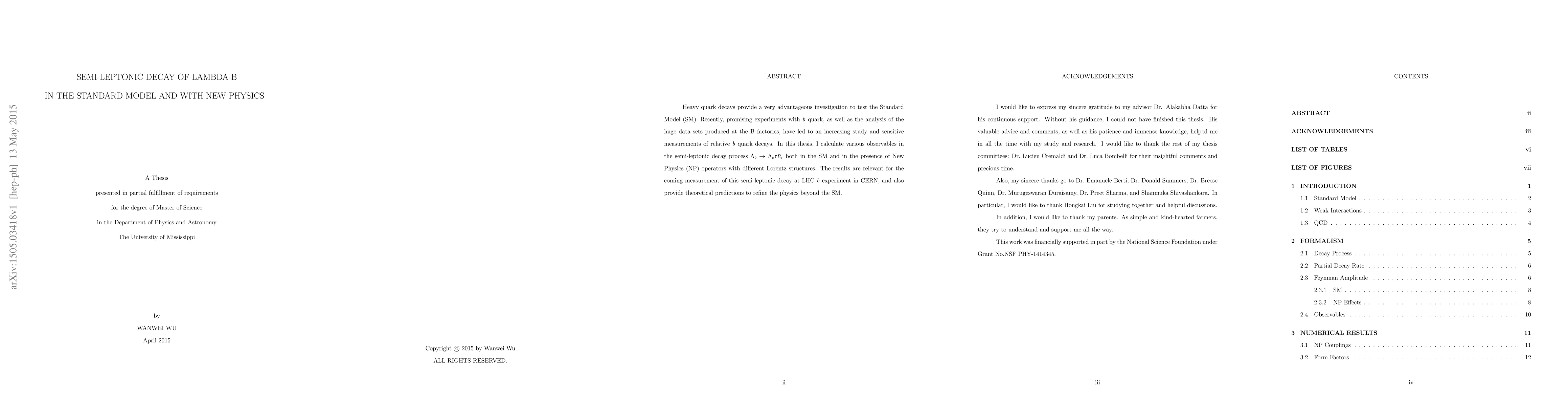 Heavy quark decays provide a very advantageous investigation to test the Standard Model (SM). Recently, promising experiments with \textit{b} quark, as well as the analysis of the huge data sets produced at the B factories, have led to an increasing study and sensitive measurements of relative \textit{b} quark decays. In this thesis, I calculate various observables in the semi-leptonic decay process $\Lambda_{b}\to \Lambda_{c}\tau\bar{\nu}_{\tau}$ both in the SM and in the presence of New Physics (NP) operators with different Lorentz structures. The results are relevant for the coming measurement of this semi-leptonic decay at LHC \textit{b} experiment in CERN, and also provide theoretical predictions to refine the physics beyond the SM.