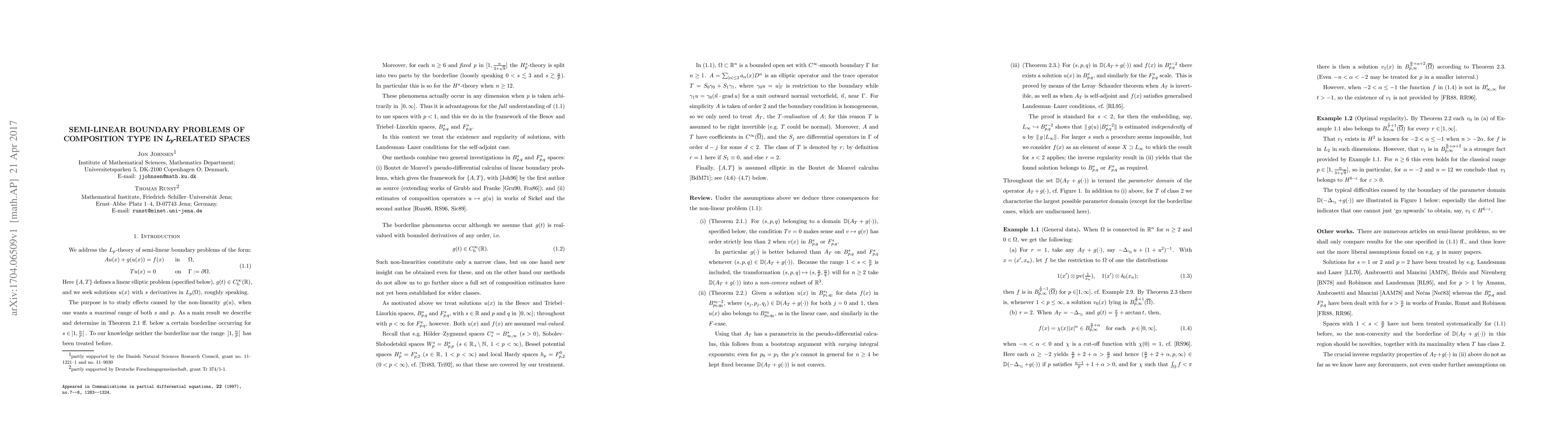 The class of problems treated here are elliptic partial differential equations with a homogeneous boundary condition and a non-linear perturbation obtained by composition with a fixed smooth function. The existence of solutions is obtained from the Leray--Schauder theorem or under a Landesman--Lazer condition on the data. Existence is carried over to a wide range of $L_p$-Sobolev spaces, using a non-trivial procedure to obtain a general regularity result. In fact the results are obtained in the general scales of Besov and Triebel--Lizorkin spaces.