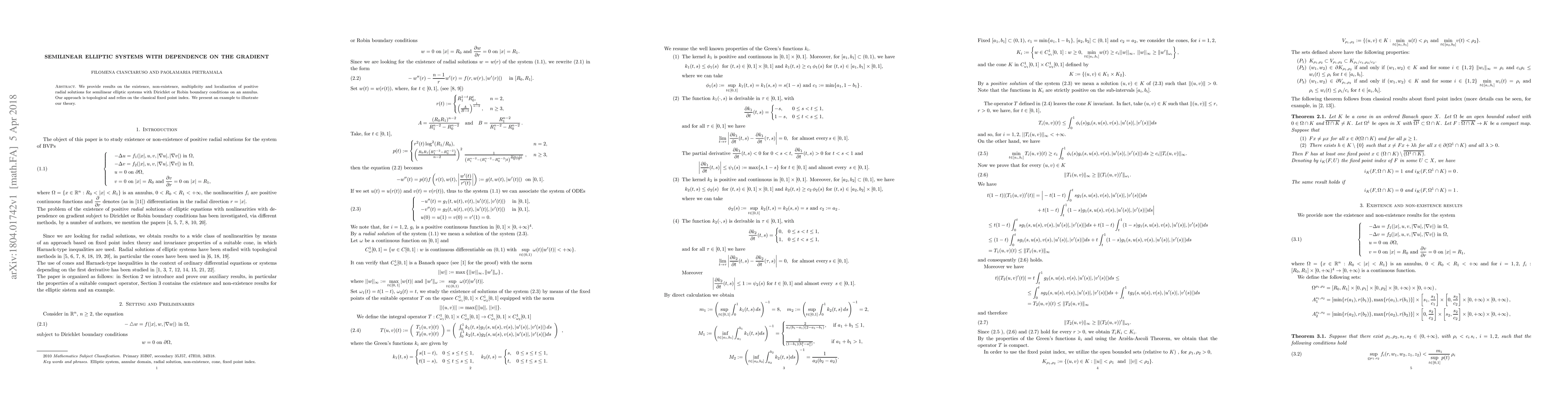 This paper investigates the existence of positive radial solutions for semi-linear elliptic systems with Dirichlet or Robin boundary conditions on an annulus using a topological approach based on the classical fixed point index.