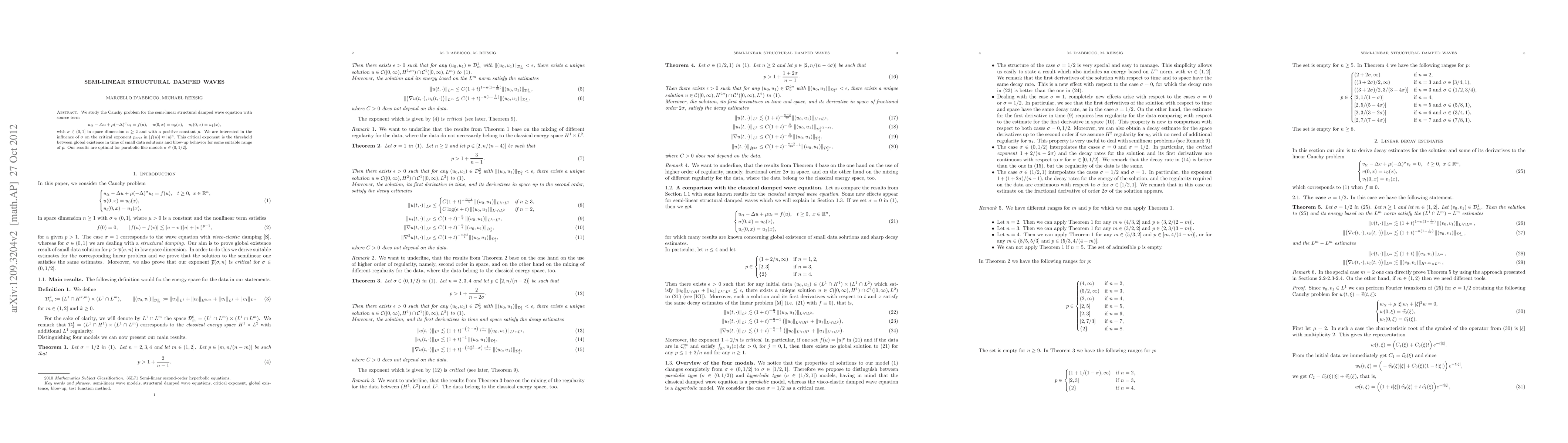 We study the global existence of small data solutions for Cauchy problem for the semi-linear structural damped wave equation with source term.
