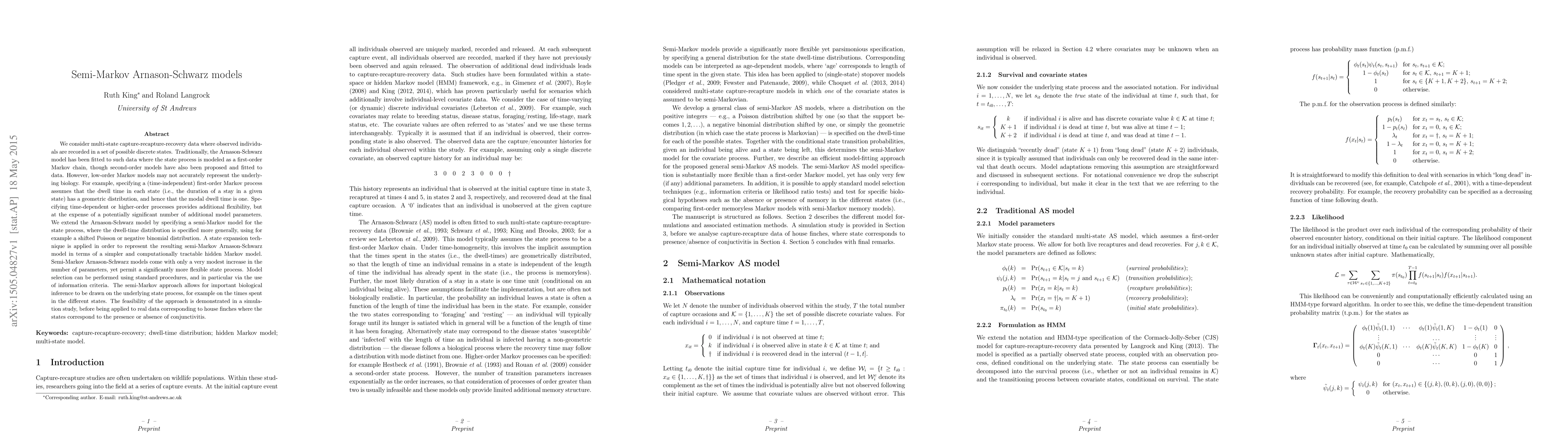 We consider multi-state capture-recapture-recovery data where observed individuals are recorded in a set of possible discrete states. Traditionally, the Arnason-Schwarz model has been fitted to such data where the state process is modeled as a first-order Markov chain, though second-order models have also been proposed and fitted to data. However, low-order Markov models may not accurately represent the underlying biology. For example, specifying a (time-independent) first-order Markov process assumes that the dwell time in each state (i.e., the duration of a stay in a given state) has a geometric distribution, and hence that the modal dwell time is one. Specifying time-dependent or higher-order processes provides additional flexibility, but at the expense of a potentially significant number of additional model parameters. We extend the Arnason-Schwarz model by specifying a semi-Markov model for the state process, where the dwell-time distribution is specified more generally, using for example a shifted Poisson or negative binomial distribution. A state expansion technique is applied in order to represent the resulting semi-Markov Arnason-Schwarz model in terms of a simpler and computationally tractable hidden Markov model. Semi-Markov Arnason-Schwarz models come with only a very modest increase in the number of parameters, yet permit a significantly more flexible state process. Model selection can be performed using standard procedures, and in particular via the use of information criteria. The semi-Markov approach allows for important biological inference to be drawn on the underlying state process, for example on the times spent in the different states. The feasibility of the approach is demonstrated in a simulation study, before being applied to real data corresponding to house finches where the states correspond to the presence or absence of conjunctivitis.
