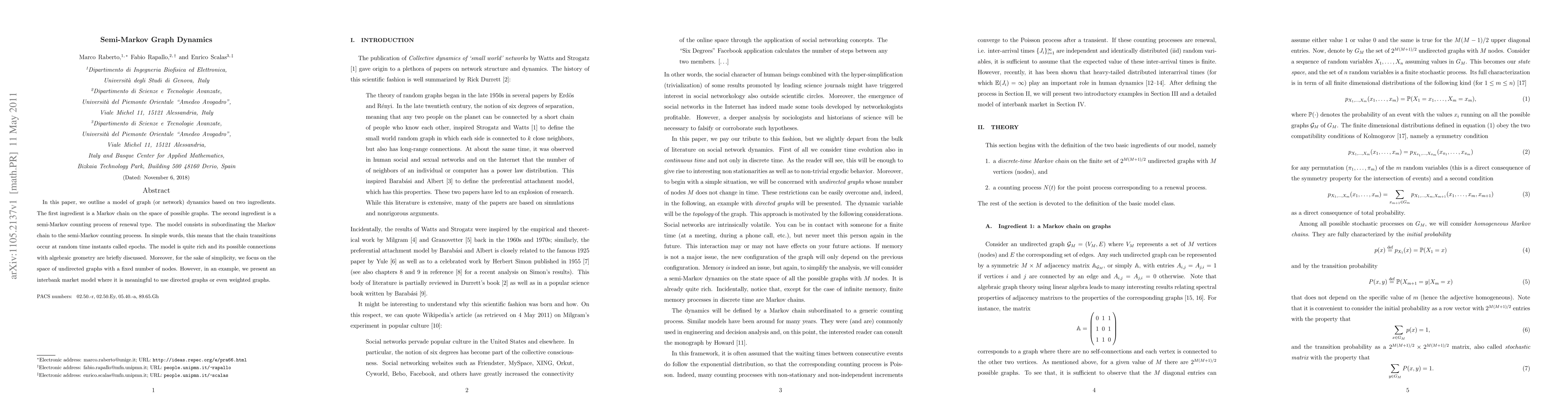 This paper introduces a model of graph dynamics that combines Markov chains with semi-Markov counting processes to capture real-time graph evolution. The model allows for the study of graph changes over time, with implications for understanding complex systems in fields like finance and network science.