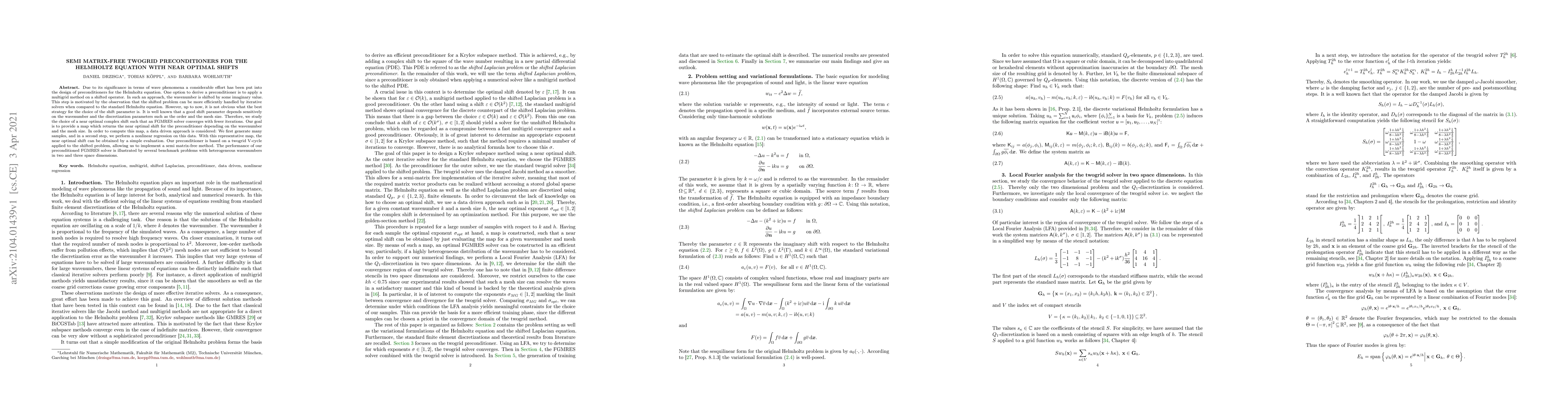 This paper proposes a semi matrix-free twogrid preconditioner for the Helmholtz equation using a shifted Laplacian, aiming to optimize the shift parameter for efficient iterative solver convergence. A data-driven approach is employed to determine near-optimal shifts based on wavenumber and mesh size, enhancing the performance of the preconditioned FGMRES solver in various benchmark problems.