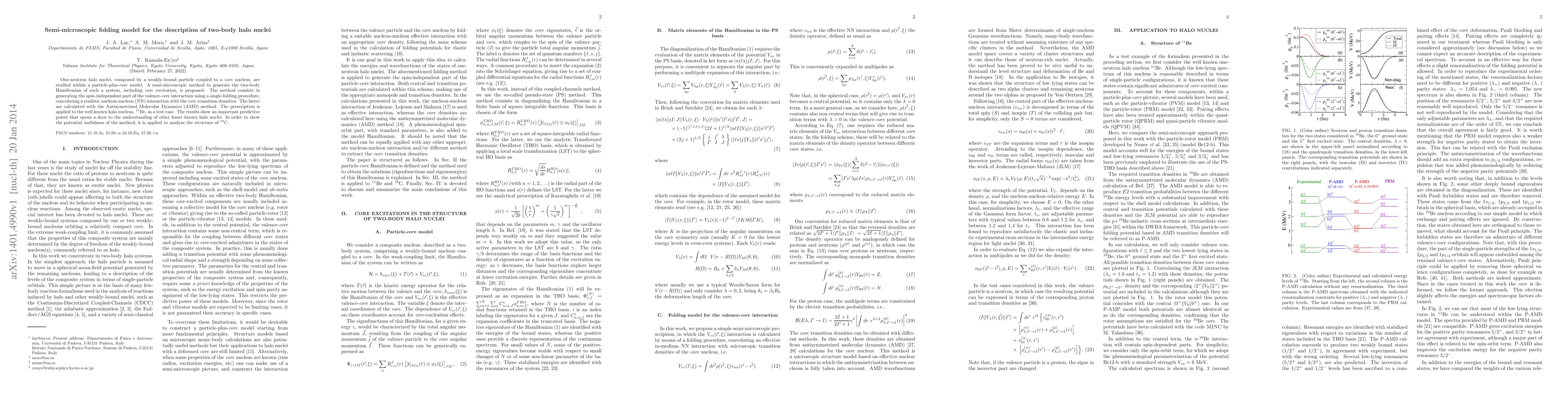 One-neutron halo nuclei, composed by a weakly-bound particle coupled to a core nucleus, are studied within a particle-plus-core model. A semi-microscopic method to generate the two-body Hamiltonian of such a system, including core excitation, is proposed. The method consists in generating the spin-independent part of the valence-core interaction using a single-folding procedure, convoluting a realistic nucleon-nucleon (NN) interaction with the core transition densities. The latter are calculated with the Antisymetrized Molecular Dynamics (AMD) method. The prescription is applied to the well known halo nucleus, $^{11}$Be, as a test case. The results show an important predictive power that opens a door to the understanding of other lesser known halo nuclei. In order to show the potential usefulness of the method, it is applied to analyze the structure of $^{19}$C.