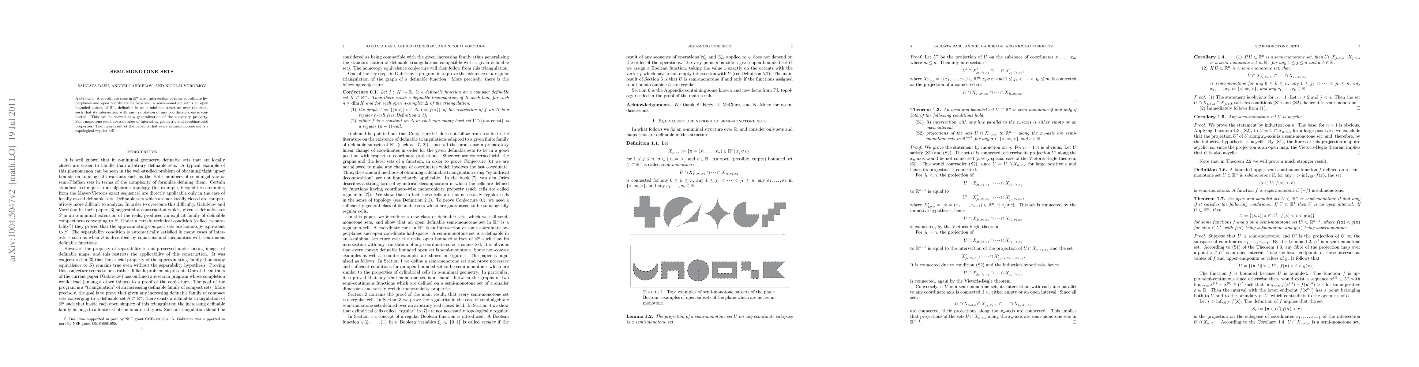 Summary: Semi-monotone sets generalize the convexity property in R^n by ensuring connected intersections with translations of coordinate cones. The paper proves that every semi-monotone set is a topological regular cell, highlighting their geometric and combinatorial significance.