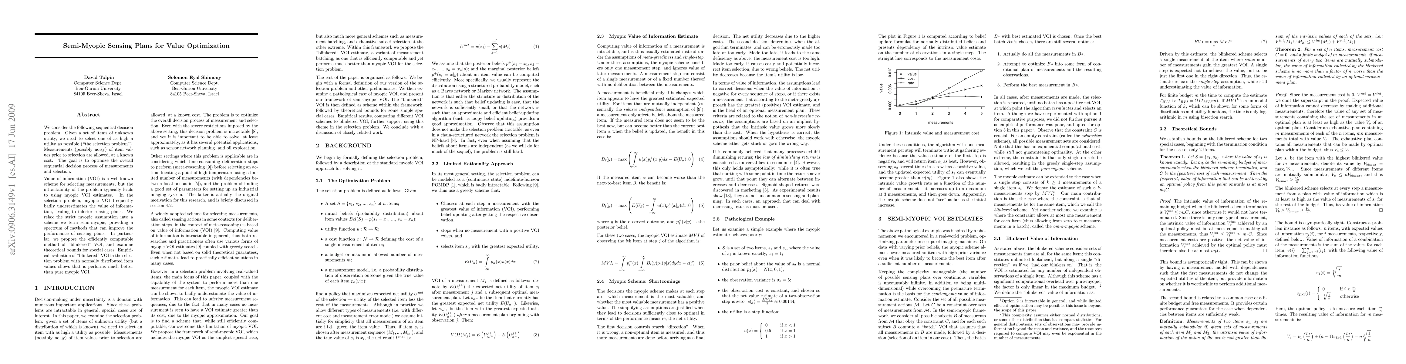 We consider the following sequential decision problem. Given a set of items of unknown utility, we need to select one of as high a utility as possible (``the selection problem''). Measurements (possibly noisy) of item values prior to selection are allowed, at a known cost. The goal is to optimize the overall sequential decision process of measurements and selection. Value of information (VOI) is a well-known scheme for selecting measurements, but the intractability of the problem typically leads to using myopic VOI estimates. In the selection problem, myopic VOI frequently badly underestimates the value of information, leading to inferior sensing plans. We relax the strict myopic assumption into a scheme we term semi-myopic, providing a spectrum of methods that can improve the performance of sensing plans. In particular, we propose the efficiently computable method of ``blinkered'' VOI, and examine theoretical bounds for special cases. Empirical evaluation of ``blinkered'' VOI in the selection problem with normally distributed item values shows that is performs much better than pure myopic VOI.