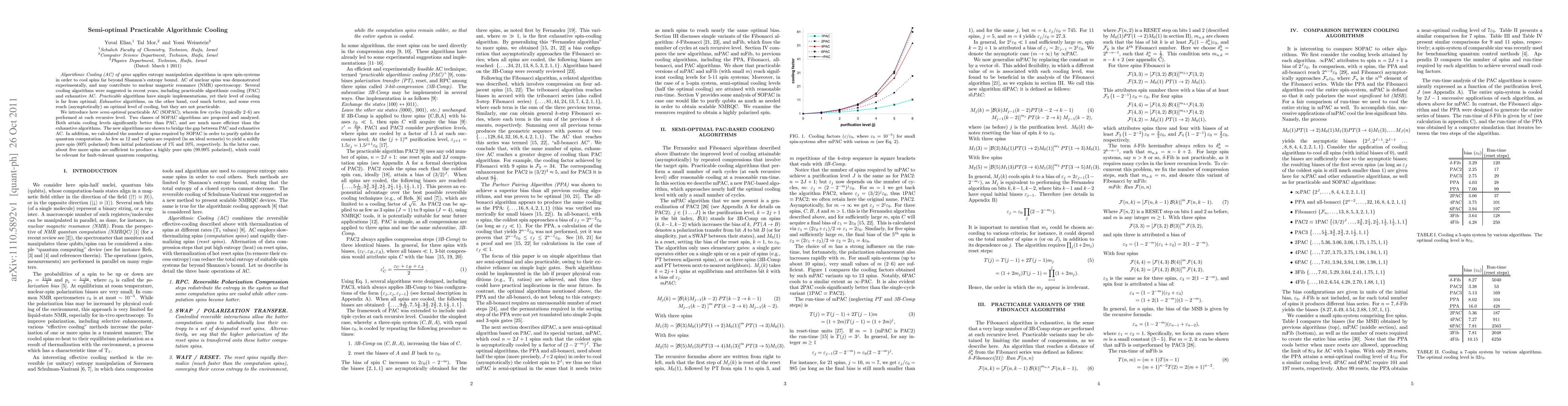 This paper introduces semi-optimal practicable algorithmic cooling (SOPAC) to bridge the gap between simple and optimal cooling algorithms. SOPAC algorithms achieve better cooling than practicable algorithms while remaining more efficient than exhaustive ones, requiring as few as 12 spins to purify qubits for quantum computation.