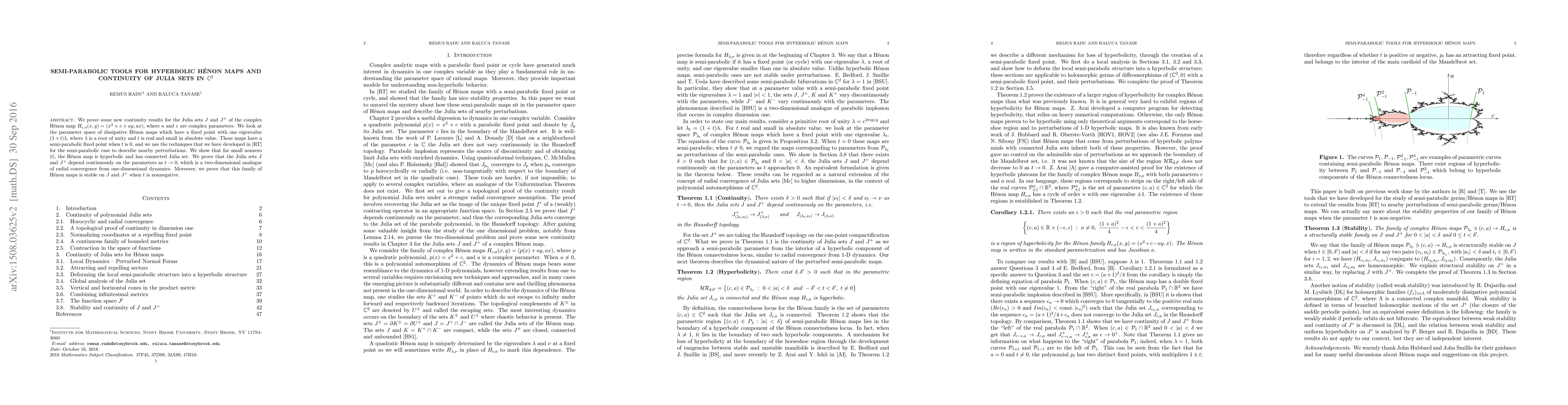 We prove some new continuity results for the Julia sets $J$ and $J^{+}$ of the complex H\'enon map $H_{c,a}(x,y)=(x^{2}+c+ay, ax)$, where $a$ and $c$ are complex parameters. We look at the parameter space of dissipative H\'enon maps which have a fixed point with one eigenvalue $(1+t)\lambda$, where $\lambda$ is a root of unity and $t$ is real and small in absolute value. These maps have a semi-parabolic fixed point when $t$ is $0$, and we use the techniques that we have developed in [RT] for the semi-parabolic case to describe nearby perturbations. We show that for small nonzero $|t|$, the H\'enon map is hyperbolic and has connected Julia set. We prove that the Julia sets $J$ and $J^{+}$ depend continuously on the parameters as $t\rightarrow 0$, which is a two-dimensional analogue of radial convergence from one-dimensional dynamics. Moreover, we prove that this family of H\'enon maps is stable on $J$ and $J^{+}$ when $t$ is nonnegative.