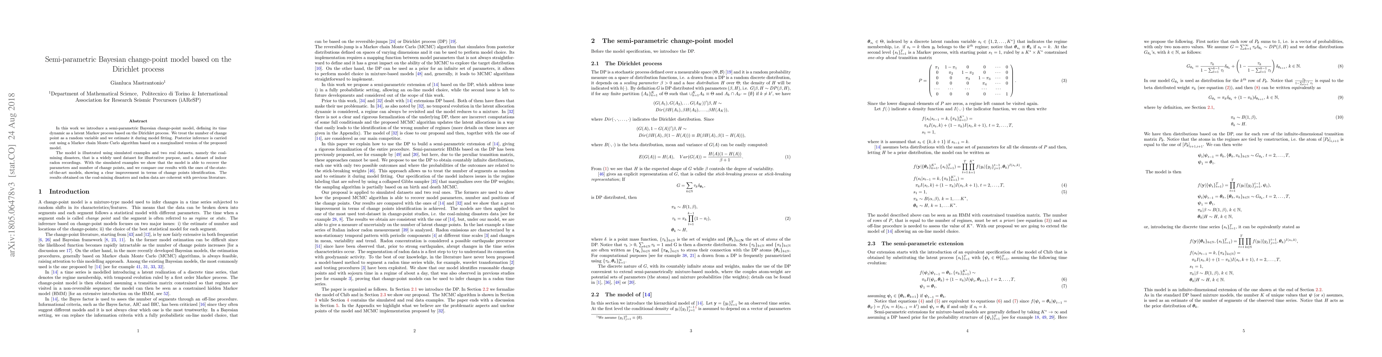This paper proposes a semi-parametric Bayesian change-point model based on the Dirichlet process, estimating the number of change points as a random variable. The model uses Markov chain Monte Carlo for posterior inference and demonstrates improved performance in identifying change points compared to state-of-the-art models through simulations and real-world datasets like coal-mining disasters and radon recordings.