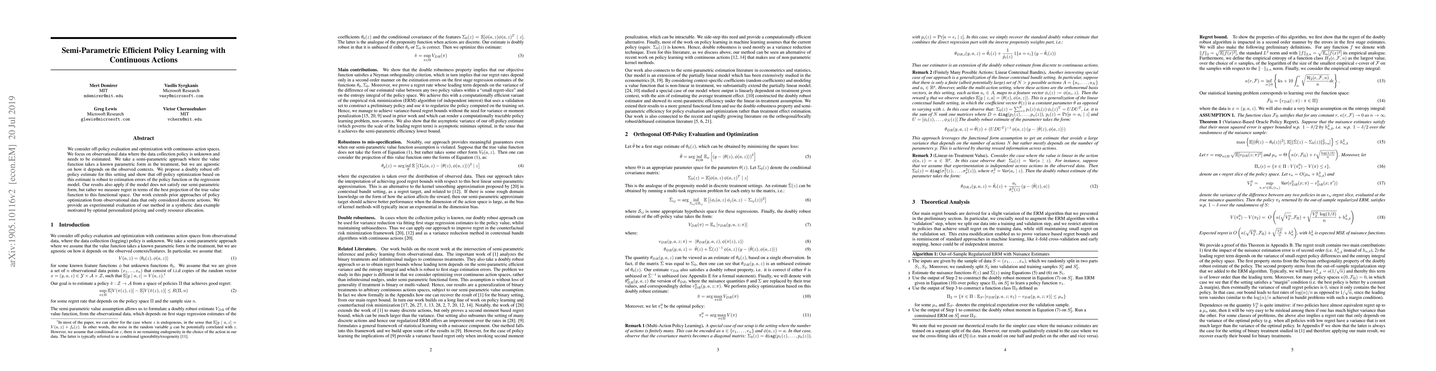 This paper proposes a semi-parametric approach for efficient policy learning in continuous action spaces using observational data, where the data collection policy is unknown. It introduces a doubly robust off-policy estimate that is robust to errors in policy function or regression model estimation, extending prior discrete action methods.