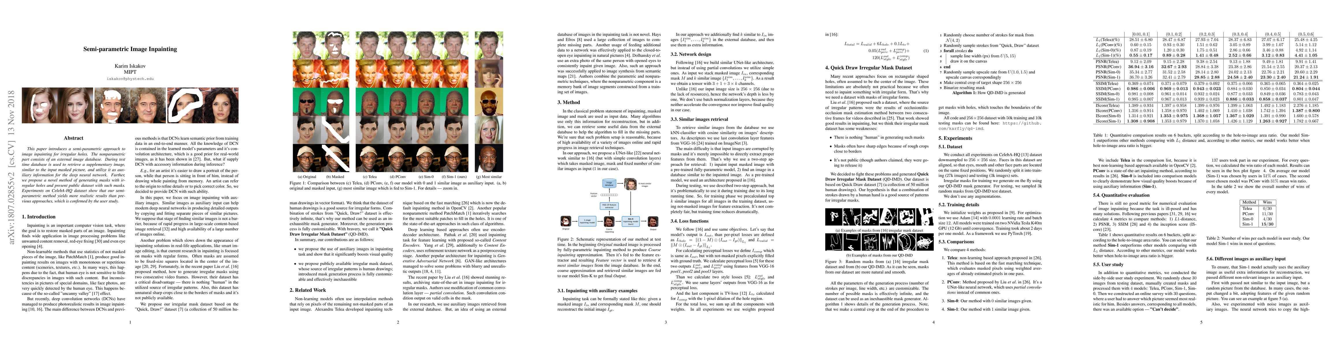 A semi-parametric approach to image inpainting for irregular holes is proposed, yielding more realistic results than previous methods, as demonstrated on the CelebA-HQ dataset.