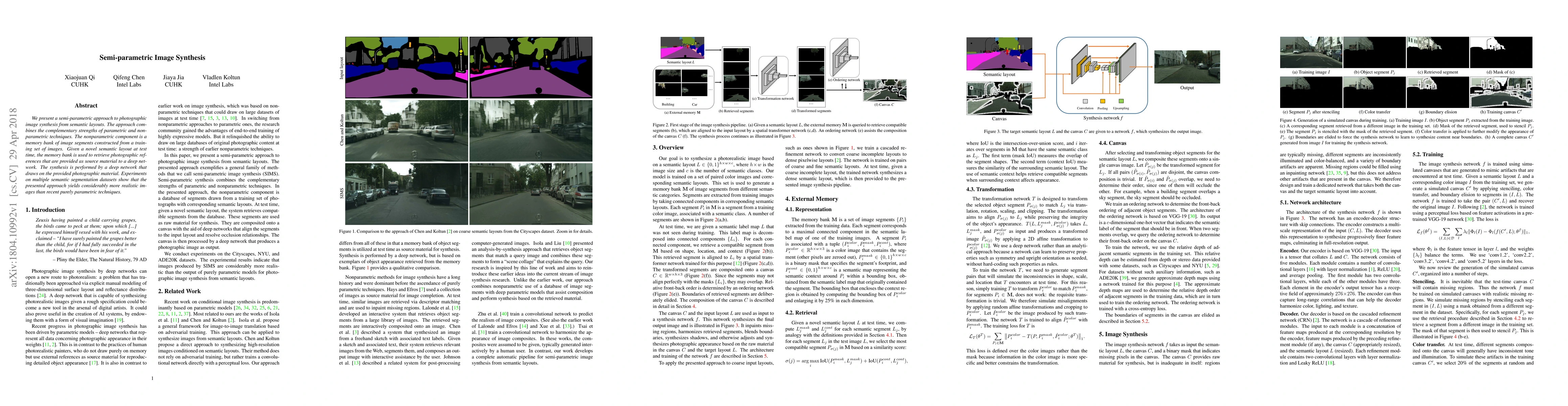This paper introduces a semi-parametric method for synthesizing realistic images from semantic layouts by combining parametric and nonparametric techniques, using a memory bank of image segments for reference. Experiments demonstrate superior realism compared to purely parametric methods.