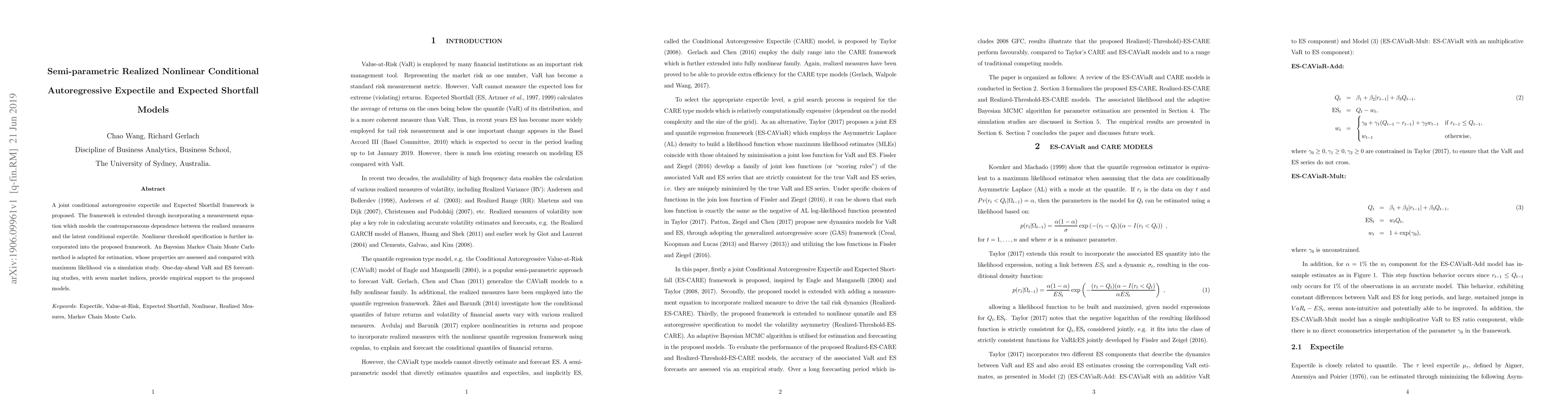 This paper proposes a semi-parametric framework combining conditional autoregressive expectile and Expected Shortfall models, incorporating a nonlinear threshold specification and Bayesian estimation. Empirical results from forecasting VaR and ES for seven market indices support the model's effectiveness.