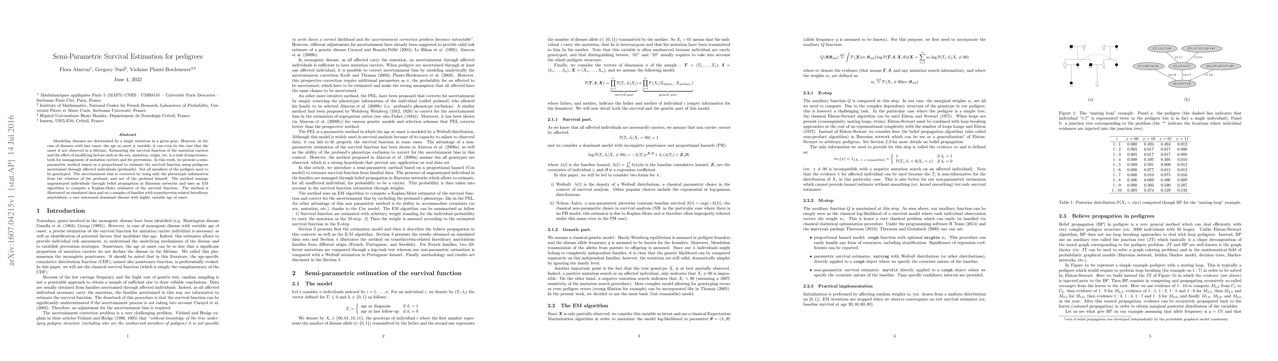 Mendelian diseases are determined by a single mutation in a given gene. However, in the case of diseases with late onset, the age at onset is variable; it can even be the case that the onset is not observed in a lifetime. Estimating the survival function of the mutation carriers and the effect of modifying factors such as the sex, mutation, origin, etc, is a task of importance, both for management of mutation carriers and for prevention. In this work, we present a semi-parametric method based on a proportional to estimate the survival function using pedigrees ascertained through affected individuals (probands). Not all members of the pedigree need to be genotyped. The ascertainment bias is corrected by using only the phenotypic information from the relatives of the proband, and not of the proband himself. The method manage ungenotyped individuals through belief propagation in Bayesian networks and uses an EM algorithm to compute a Kaplan-Meier estimator of the survival function. The method is illustrated on simulated data and on a samples of families with transthyretin-related hereditary amyloidosis, a rare autosomal dominant disease with highly variable age of onset.