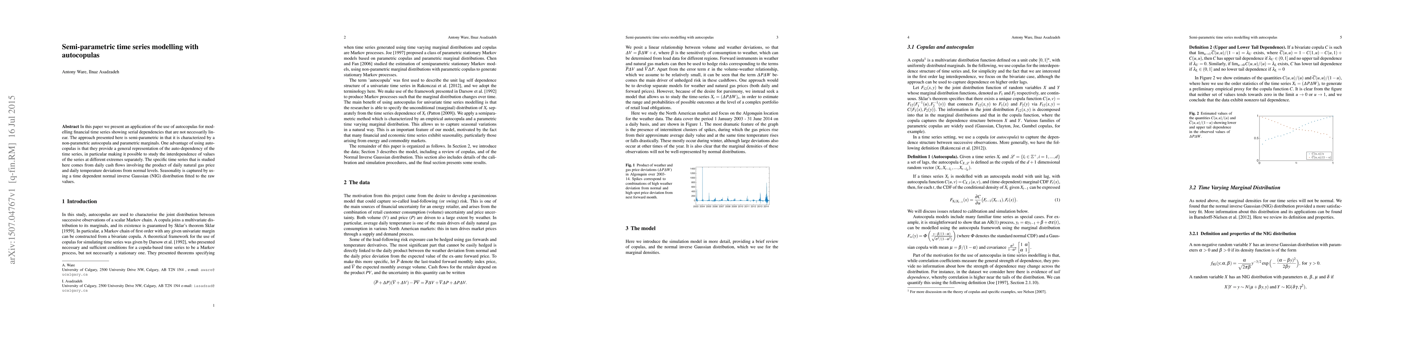 In this paper we present an application of the use of autocopulas for modelling financial time series showing serial dependencies that are not necessarily linear. The approach presented here is semi-parametric in that it is characterized by a non-parametric autocopula and parametric marginals. One advantage of using autocopulas is that they provide a general representation of the auto-dependency of the time series, in particular making it possible to study the interdependence of values of the series at different extremes separately. The specific time series that is studied here comes from daily cash flows involving the product of daily natural gas price and daily temperature deviations from normal levels. Seasonality is captured by using a time dependent normal inverse Gaussian (NIG) distribution fitted to the raw values.