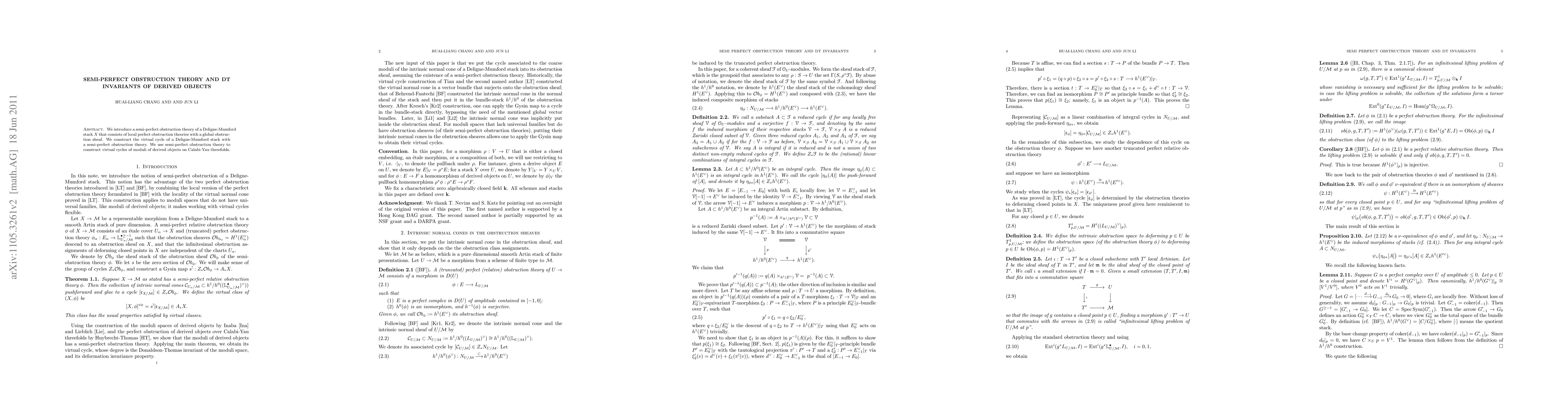 Summary: This paper develops semi-perfect obstruction theory for Deligne-Mumford stacks, showing it parallels perfect obstruction theory and utilizes it to construct virtual cycles for moduli of derived objects on Calabi-Yau threefolds, addressing descent issues via the intrinsic normal cone.