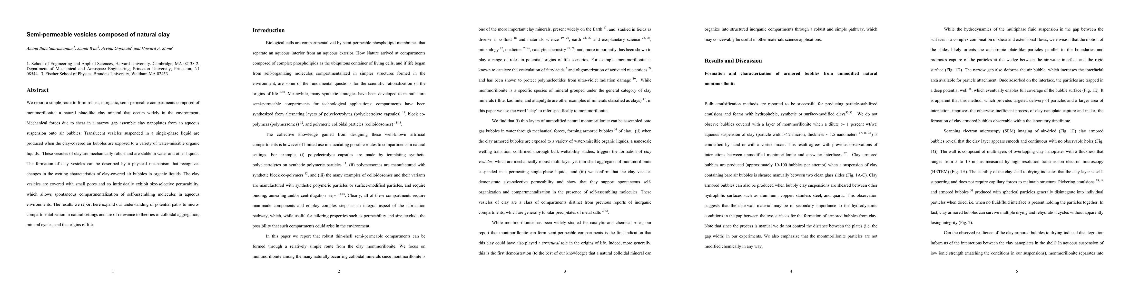 We report a simple route to form robust, inorganic, semi-permeable compartments composed of montmorillonite, a natural plate-like clay mineral that occurs widely in the environment. Mechanical forces due to shear in a narrow gap assemble clay nanoplates from an aqueous suspension onto air bubbles. Translucent vesicles suspended in a single-phase liquid are produced when the clay-covered air bubbles are exposed to a variety of water-miscible organic liquids. These vesicles of clay are mechanically robust and are stable in water and other liquids. The formation of clay vesicles can be described by a physical mechanism that recognizes changes in the wetting characteristics of clay-covered air bubbles in organic liquids. The clay vesicles are covered with small pores and so intrinsically exhibit size-selective permeability, which allows spontaneous compartmentalization of self-assembling molecules in aqueous environments. The results we report here expand our understanding of potential paths to micro-compartmentalization in natural settings and are of relevance to theories of colloidal aggregation, mineral cycles, and the origins of life.