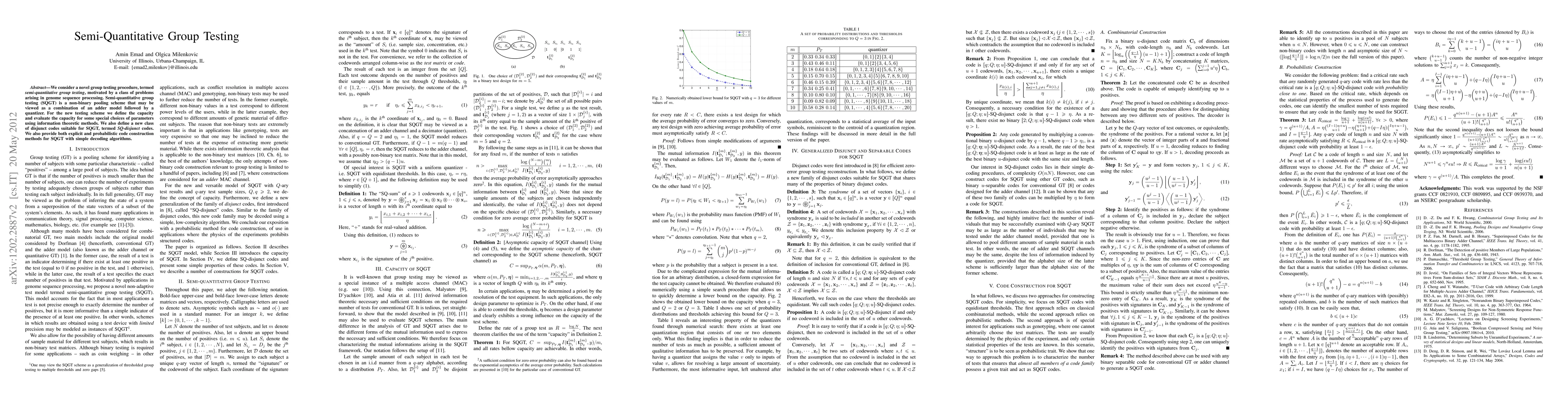 This paper introduces semi-quantitative group testing (SQGT), a non-binary pooling method for genome sequence processing, combining an adder model with a quantizer. It defines SQGT capacity and evaluates it using information theory, along with a new class of SQ-disjunct codes and construction methods for efficient decoding.