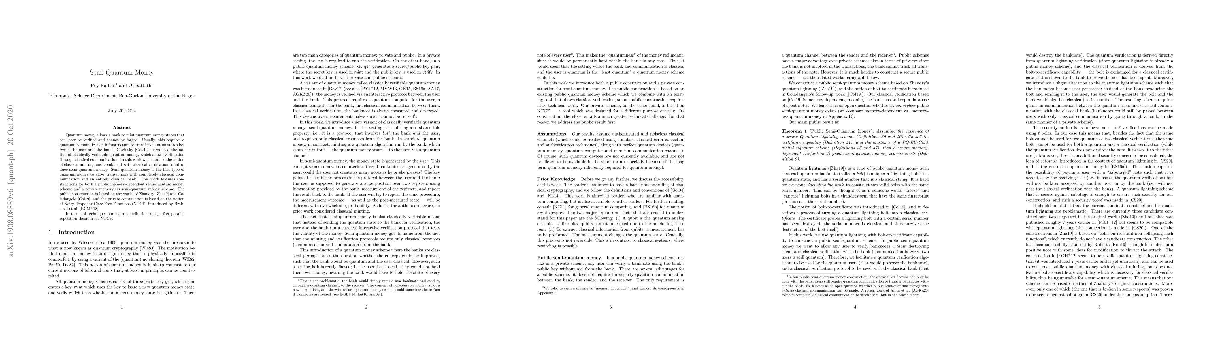 This paper introduces semi-quantum money, a novel concept that allows for transactions using only classical communication while maintaining security, unlike traditional quantum money. The authors present two constructions: one based on public memory and another on private memoryless schemes, with the latter relying on a perfect parallel repetition theorem for Noisy Trapdoor Claw Free Functions.