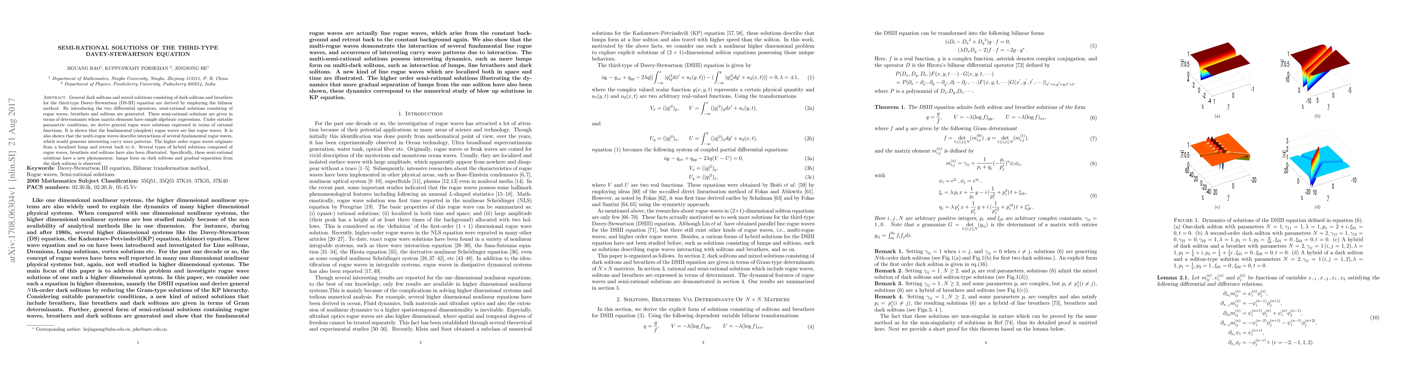 Researchers derive semi-rational solutions to the third-type Davey-Stewartson equation using the bilinear method, revealing new phenomena like lumps forming on dark solitons and interactions that generate curvy wave patterns.