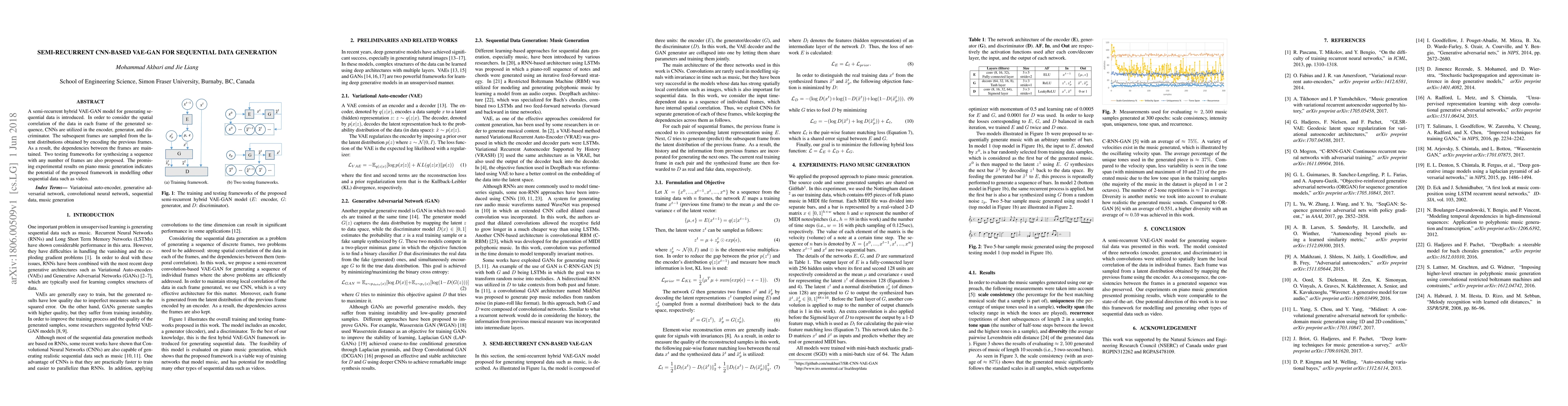 A semi-recurrent hybrid VAE-GAN model for generating sequential data is introduced. In order to consider the spatial correlation of the data in each frame of the generated sequence, CNNs are utilized in the encoder, generator, and discriminator. The subsequent frames are sampled from the latent distributions obtained by encoding the previous frames. As a result, the dependencies between the frames are maintained. Two testing frameworks for synthesizing a sequence with any number of frames are also proposed. The promising experimental results on piano music generation indicates the potential of the proposed framework in modeling other sequential data such as video.