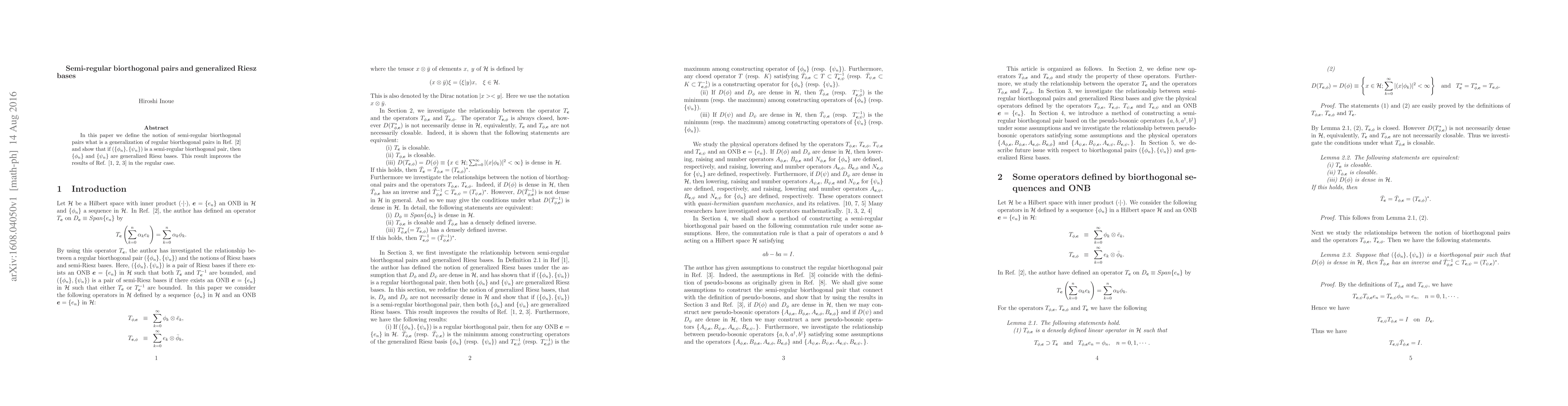 In this paper we define the notion of semi-regular biorthogonal pairs what is a generalization of regular biorthogonal pairs in Ref. \cite{hiroshi1} and show that if $(\{ \phi_{n} \} , \{ \psi_{n} \})$ is a semi-regular biorthogonal pair, then $\{ \phi_{n} \}$ and $\{ \psi_{n} \}$ are generalized Riesz bases. This result improves the results of Ref. \cite{h-t, hiroshi1, h-t2} in the regular case.