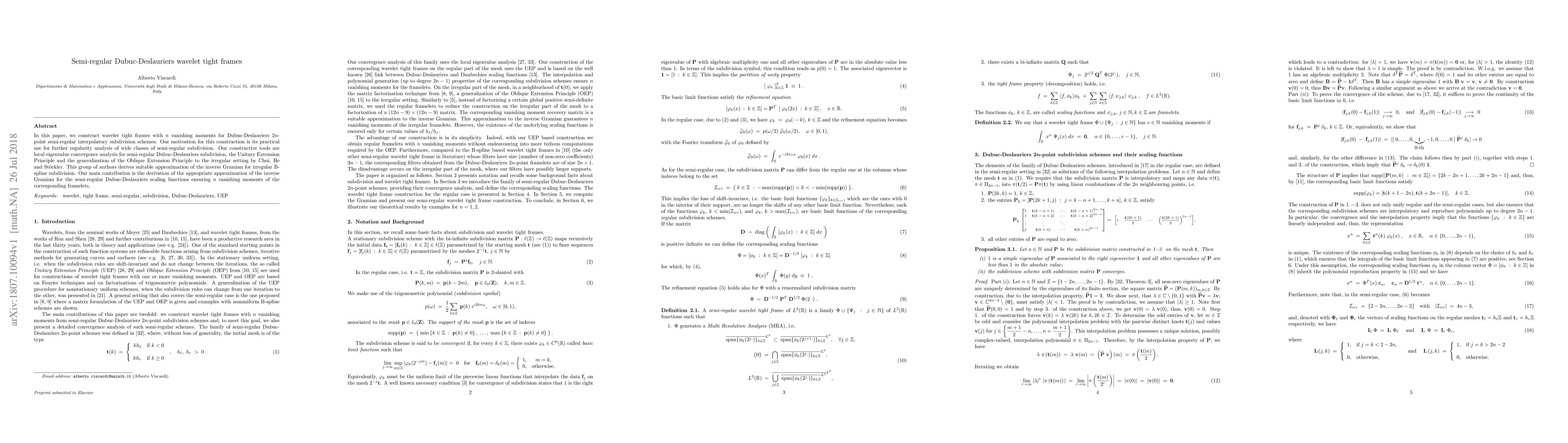 In this paper, we construct wavelet tight frames with n vanishing moments for Dubuc-Deslauriers 2npoint semi-regular interpolatory subdivision schemes. Our motivation for this construction is its practical use for further regularity analysis of wide classes of semi-regular subdivision. Our constructive tools are local eigenvalue convergence analysis for semi-regular Dubuc-Deslauriers subdivision, the Unitary Extension Principle and the generalization of the Oblique Extension Principle to the irregular setting by Chui, He and St\"ockler. This group of authors derives suitable approximation of the inverse Gramian for irregular Bspline subdivision. Our main contribution is the derivation of the appropriate approximation of the inverse Gramian for the semi-regular Dubuc-Deslauriers scaling functions ensuring n vanishing moments of the corresponding framelets.